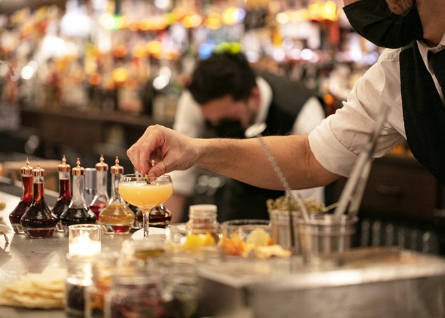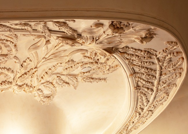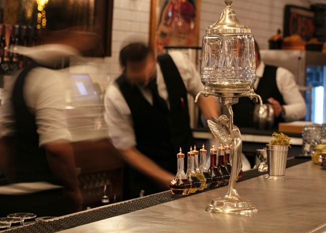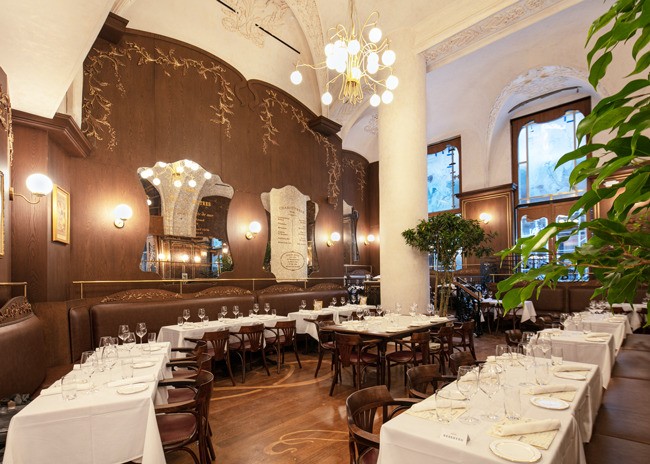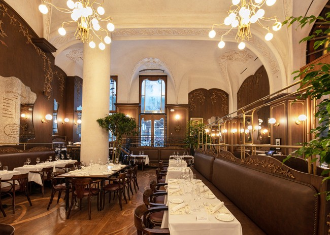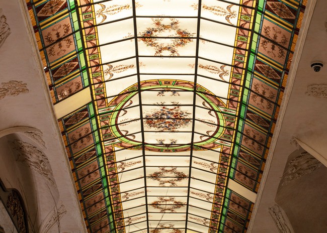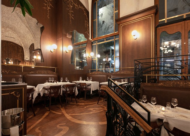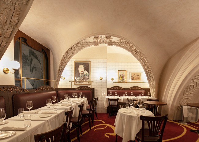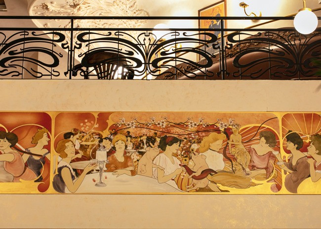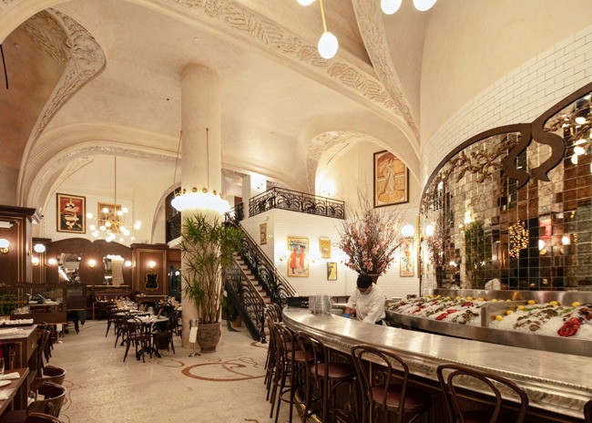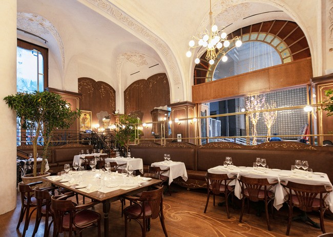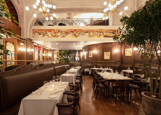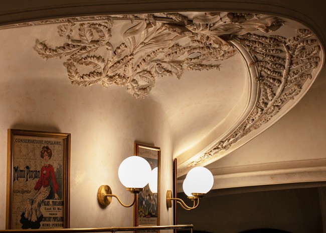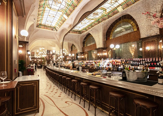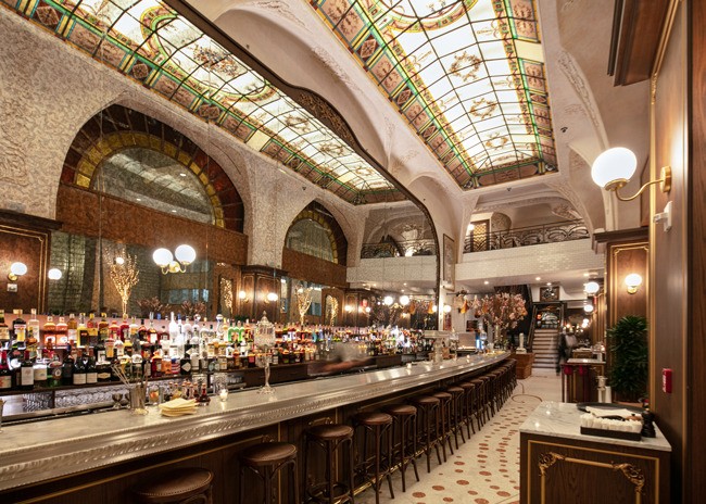 Inside, a 48-foot pewter bar greets guests. The bar was made using a traditional tin technique by a third-generation French craftsman. A 150-year-old vaulted decorative ceiling sets the stage and prominently features a glass skylight that once graced a private estate next to the Opera Garnier in Paris but was salvaged before demolition. Fern and acanthus plant motifs found in the antique hand-painted glass are replicated throughout the space.