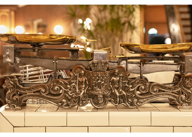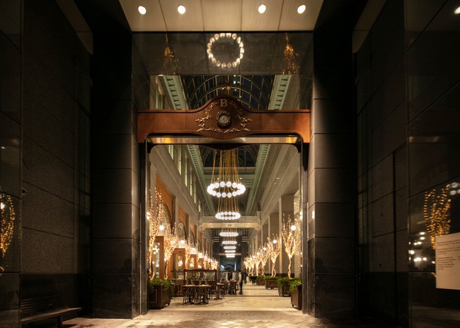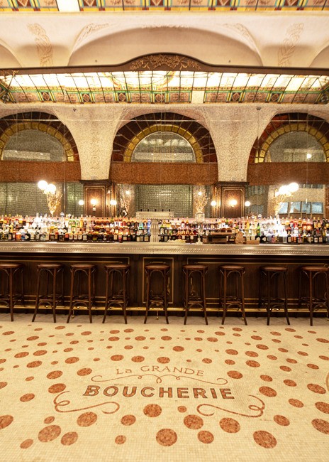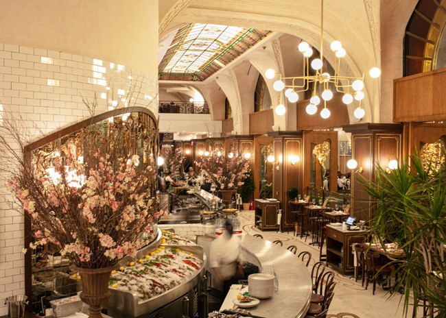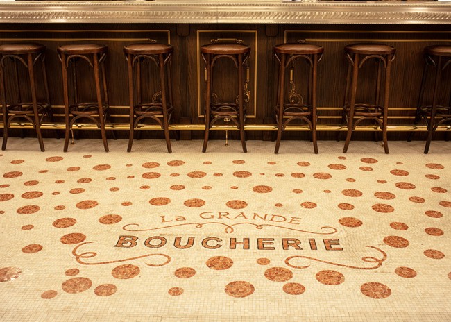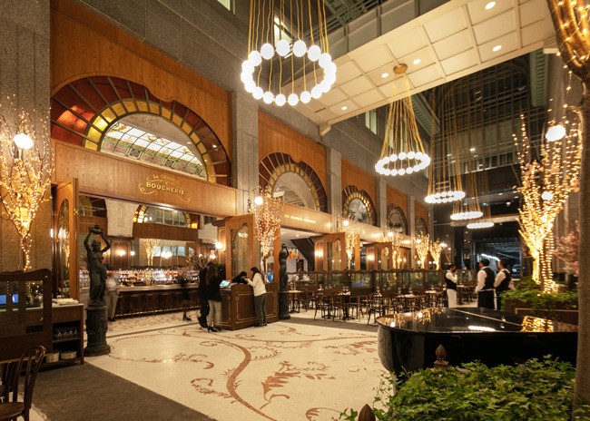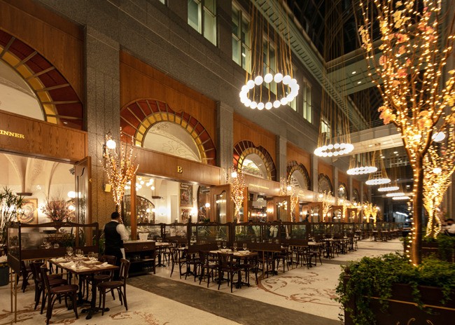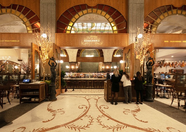Designed by Julien Legeard of The Prestige Group and owner Emil Stefkov, La Grande Boucherie takes full advantage of the soaring space’s classical architecture. A grand arcade offers year-round outdoor dining with a heated floor system below half-inch mosaic Carrera Marble tiles. Monumental brass chandeliers glow above, while sconces adorn the façade of the restaurant, bringing a touch of intimate lighting to the grand space. The arcade lighting fixtures are reminiscent of early 20th century Paris. Adding an organic element, potted cherry blossom trees sit along each column of the restaurant’s exterior.