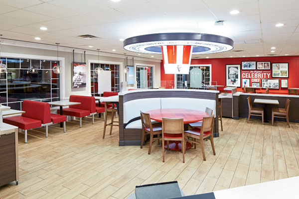 The first location outside of New York City, Mah-Ze-Dahr’s Washington, D.C. space includes the brand’s signature deep blue and marble decor. Walking through the bakery, a 12-seat counter flanks the entry, inviting patrons for a quick coffee, pastry or place to work. A 20-foot beaded curtain adds shimmer while diffusing the sunlight that pours into the space. Along the beaded curtain hangs polished chrome lighting pendants with marble accents. The clear pendant globes feature an exposed curled LED filament that provides a warm glow.