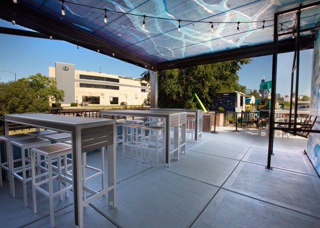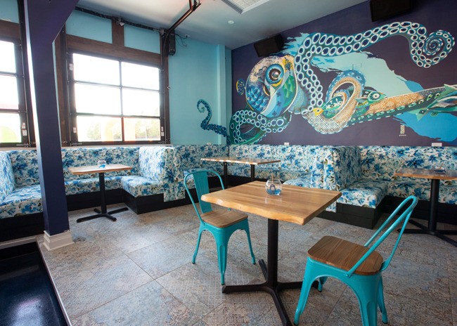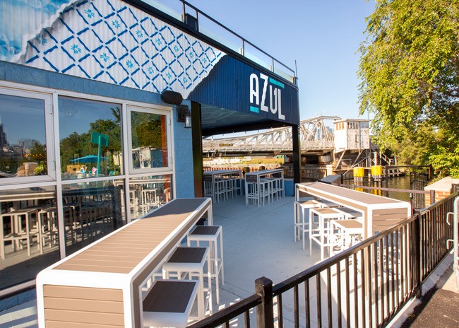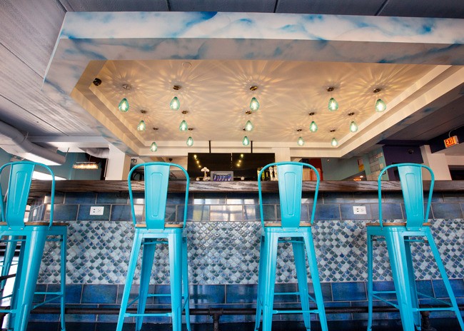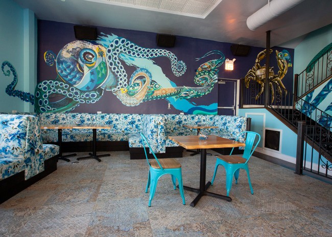 This Latin-Inspired, seafood-focused restaurant and bar from Social Light Group, designed by Taylor Williams, features shades of blue with bright white and orange accents throughout. Original artwork punctuates the 6,550-square-foot space while an eclectic array of glass, metal and ceramic light fixtures hang from the ceiling. Mexican artist Senkoe created a stunning mural in the restaurant’s main lounge. Oversized windows flood the main dining room and bar with natural light, creating a warm ambiance year-round. A lounge-like area next to the dining room boasts plush banquettes and a newly installed set of garage doors, which create a wide-open feel in the summer. The rooftop, one of the largest open-air rooftops in the city, opened in late summer 2020 to offer more dining options during pandemic closures. Two additional patios situated on the first and second floors provide additional options for al fresco dining.