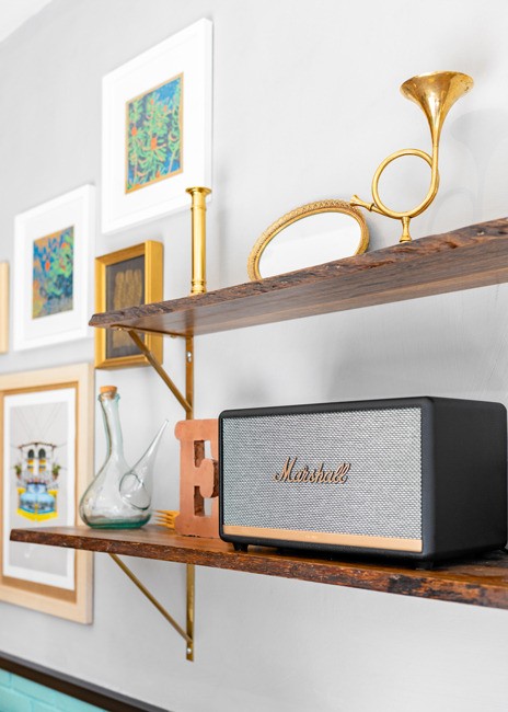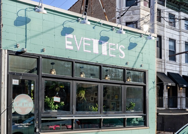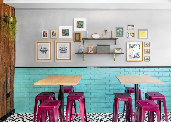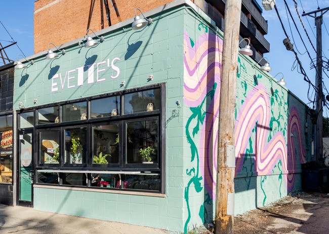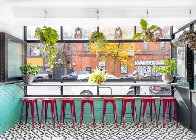 Designed by Siren Betty Designs, Evette’s aesthetic utilizes textures, patterns, and colors like turquoise and peach to reflect the vibrancy of both Lebanese and Mexican cultures. Prominent design features include brightly colored furniture, counters clad with repurposed wood, geometric black and white floor tile, and distinctive wicker lighting fixtures. Oversized storefront windows, decorated with hanging plants, flood the space with natural light and open up for indoor-outdoor dining and carryout. The open kitchen sits along the back wall of the intimate, 300-square-foot space with just 16 seats inside and eight at the countertop. Vintage prints and photos of neighborhoods in Beirut and a lucha libre wrestler grace the wall. To maximize Evette’s visibility on the busy