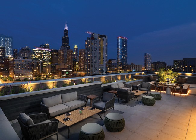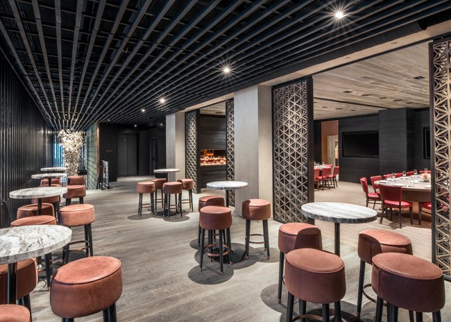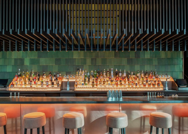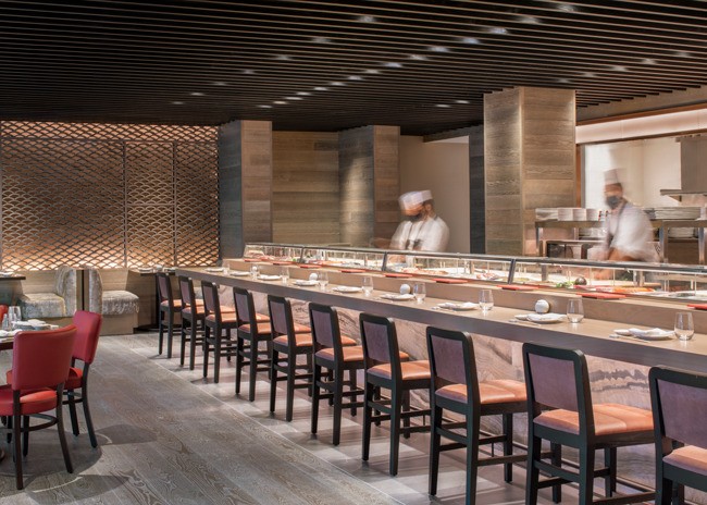 Karen Herold’s Studio K Creative, in collaboration with Modif Architecture, sought to blend elements inspired by the weathered beauty of Japan’s ancient buildings with the industrial roots of Chicago’s West Loop for this 10,000-square-foot restaurant that opened in October. The restaurant offers a 262-seat dining room and a 32-seat jewel-box sushi bar overlooking the open kitchen. The space features a color base of wet sands complemented by rich greens, copper and black. Designed by Herold, an installation of resin leaves painstakingly fabricated by hand in Chicago looks like a forest canopy. Guests are greeted by towering columns featuring undulating half-moons above patinated copper bases that resemble two-story ancient samurai swords. High ceilings and low furniture play with scale and proportion to accentuate a soaring feeling in the space. Around the corner, stacked green roof tiles line the main wall leading to the mezzanine. Above, a pre-function space perfect for small gatherings features high-top seating, an enviable perch to overlook the energetic restaurant below. Two private dining rooms feature carved sliding screens that cleverly mask state-of-the-art audiovisual equipment. Smart windows bring the outside in through controlled natural light and tinting without the need for blinds or shades.