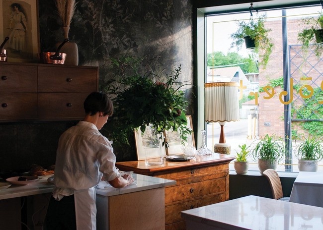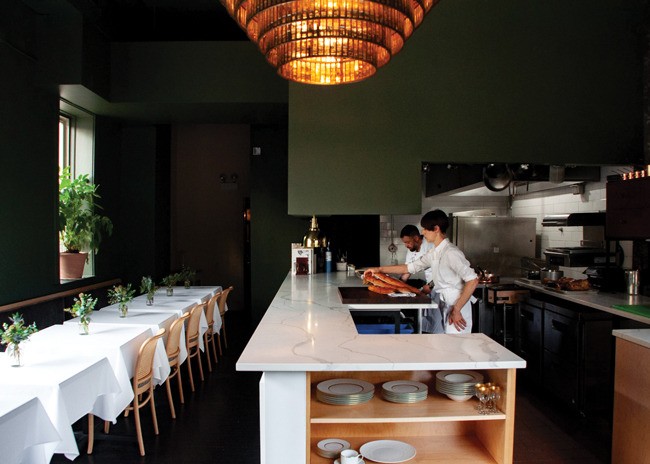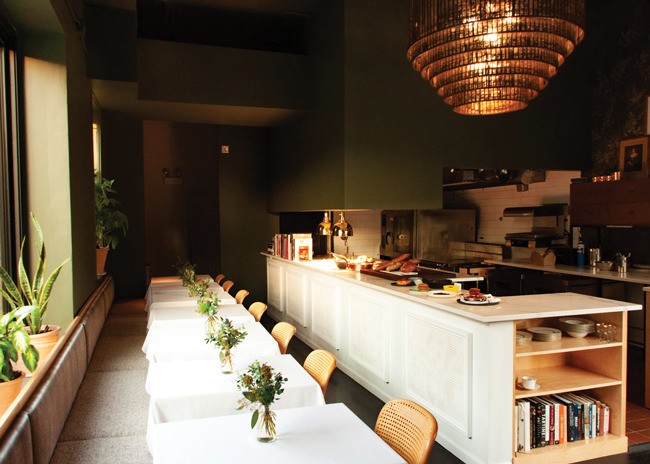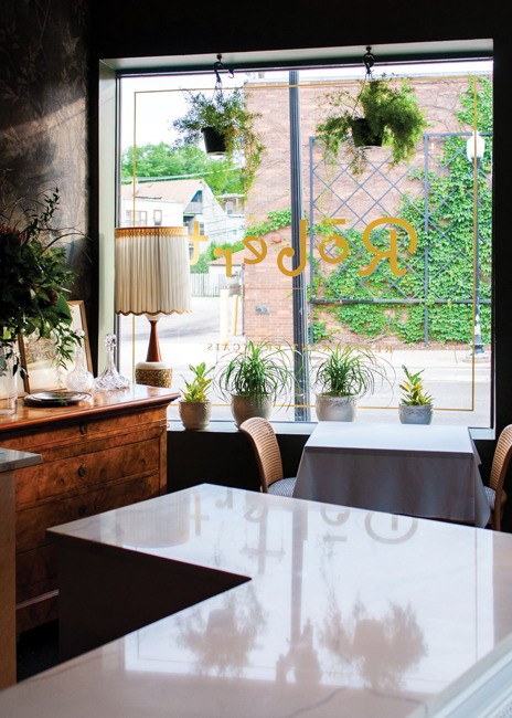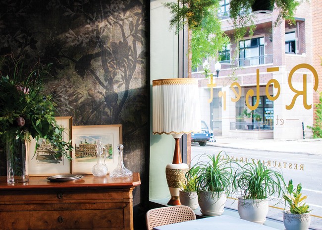 This intimate French restaurant, just shy of 400 square feet, opened in the North Center neighborhood in August. Designed by Siren Betty Designs, the space is meant as a tribute to Chef Rob Shaner’s father, evoking feelings of a family dinner party, with Parisienne influences reminiscent of Shaner’s childhood spent in France. An open kitchen with large white-veining marble countertops serves as the focal point for the space, offering a view into the action from every seat. A mushroom-colored velvety banquette spans the opposite wall with wall-to-wall windows just above. Deep greens, rich browns, crisp whites, natural wood with golden accents, and a seven-tier chandelier adds a bit of elegance. One wall is papered in a chocolate-colored nature scene. Frames with black and white photographs and pencil drawings of Paris pair with custom cabinetry by Vero Design + Build.