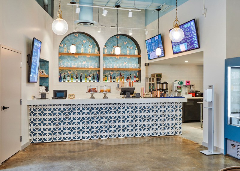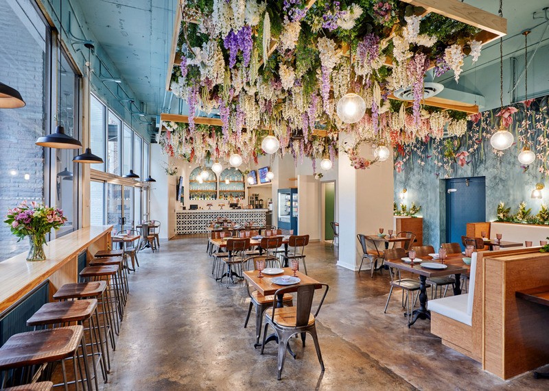 Sarah and Gabriel Ayala opened this colorful, CBD-centric brunch spot and daytime bar in the Lakeview neighborhood in October. SPACE Architects + Planners created a playful, magical outdoor feel for the space with inspiration drawn from the owners’ travels with specific nods to Singapore’s Changi Airport and Trolls The Experience in New York City. Pastels dominate the 2,000-square-foot space that has an open layout with high ceilings and floor-to-ceiling windows. Dining room walls feature wallpaper with hanging flowers and colorful hummingbirds paired with a sky-blue ceiling and hanging flowers. Clear whiteboard material covering the entrance wall allows guests to draw pictures or sign their names with dry erase markers. A touch screen mirror takes photos of guests akin to a modern photo booth.
