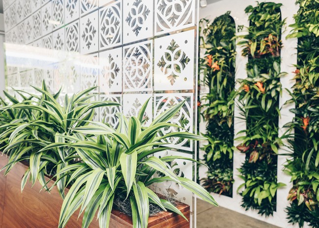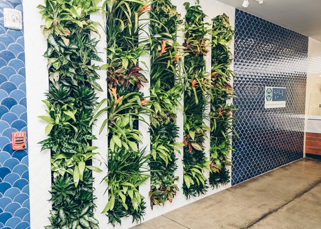 Given the name includes two green herbs, Parsley & Mint uses a similarly colored wall filled with plants to provide some visual contrast for guests.