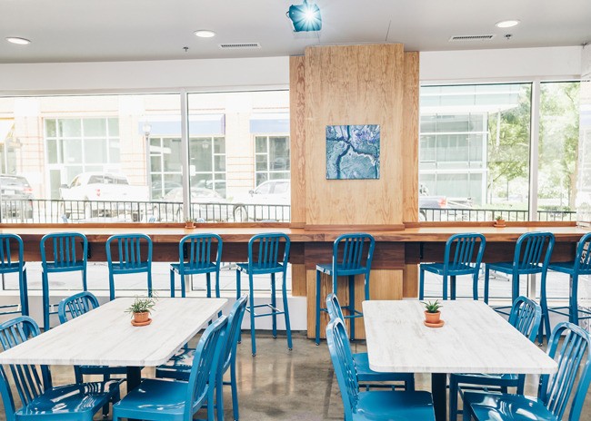 Parsley & Mint’s color palette includes plenty of cool blues offset by warm earth tones throughout. Seating options include four tops as well as individual seats at a counter that looks out on to the street.
