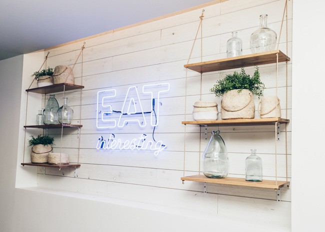 The restaurant’s design also includes an illuminated piece that encourages guests to “eat interesting,” undoubtedly looking to encourage customers to explore the Mediterranean-themed menu that includes such items as citrus chicken, house-made falafel, and lamb meatballs as well as house-made dressings and spreads including baba ghanoush, spicy harissa and sumac dijonnaise.
