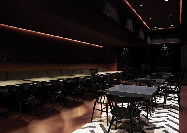 In old tavern designs the dining area was hidden to passersby and separated from the bar where people would linger and drink. At Osteria Moderna, a cafe area fronts the space, offering an area for customers that want to have a quick bite at breakfast or lunch. Patrons must pass through a system of metal separators to find the dining area and bar. A uniform color scheme is broken up by integrated metal elements and concrete inserts.