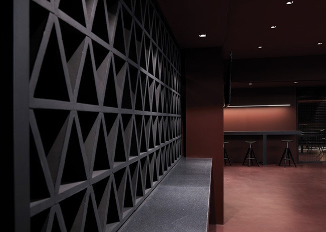 Light and shadow are used to dramatic effect throughout the 350-square-meter interior. The cafe area is bright with natural light entering the building from windows located along the sides of the building. At night, lighting is used to create focal points and intimate spaces.