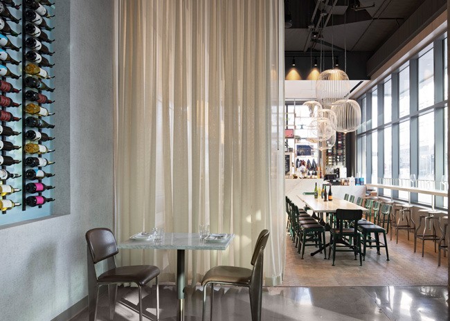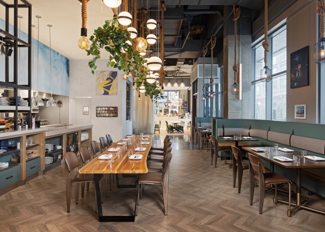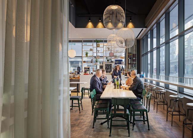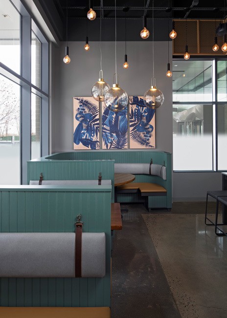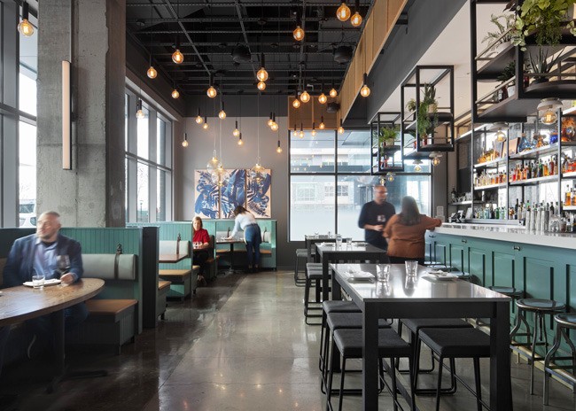 The CallisonRTKL design draws from the neighborhood’s history as an industrial shipping port, as epitomized by the handcrafted logo inspired by a ship’s porthole. Blending natural, unfinished materials and nautical-inspired lighting elements with more elevated, contemporary design gives the space a modern and timeless aura. Warm wood textures, biophilic elements, and strategic pops of color reflect the neighborhood’s energy, growth and diversity. Modern colors, layered textures, and elegant seating further emphasize this sophisticated ambiance.