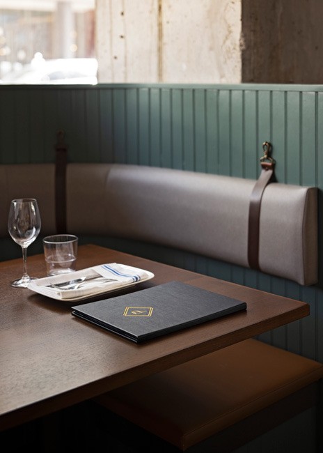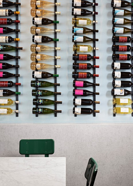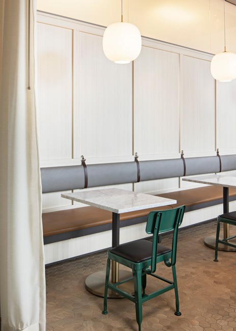 Porter’s design allows it to offer a different experience in each section of the restaurant. To define each of these unique zones, the design team used an ombre color scheme. The bar is the darkest and most moody space, and the open kitchen uses a medium-range color story. This bridges the gap to the bakery, the lightest and brightest space in the restaurant. The design uses similar finishes throughout, in various shades, providing cohesion while still keeping each zone’s visual identity distinct, helping customers navigate the different services on offer.