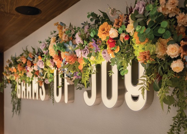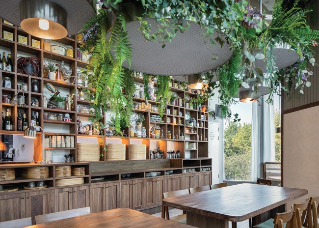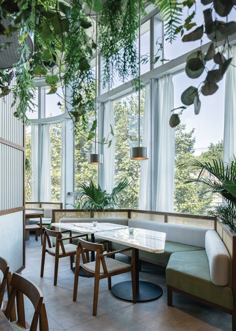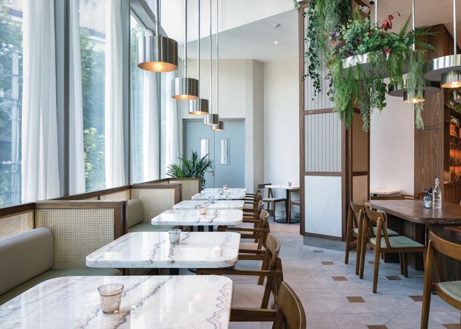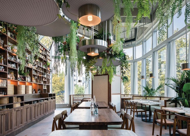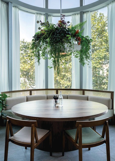 - A large hanging garden creates a rich and tranquil ceiling of flora above soft pink onyx tables.