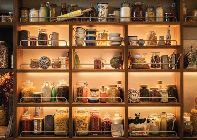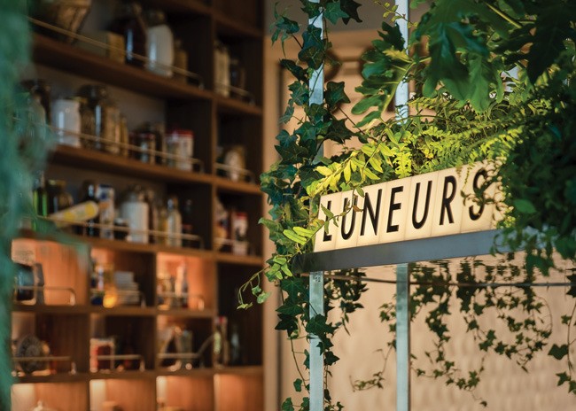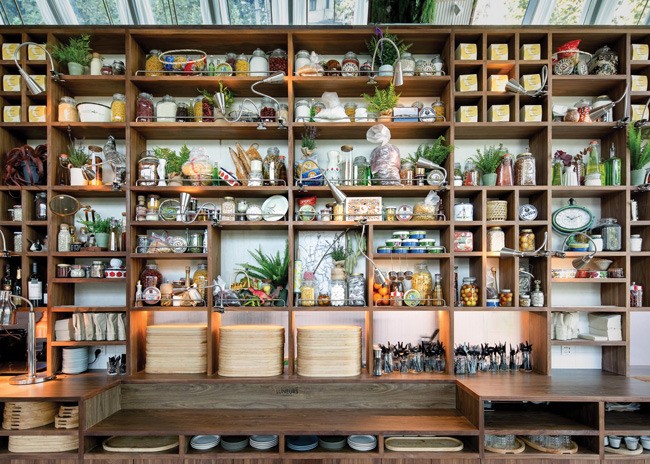 - Floor-to-ceiling timber shelving curated with French food and curios line the counter area.