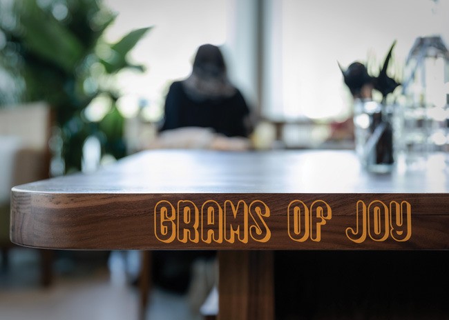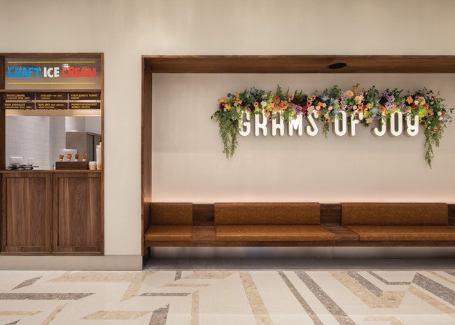The acoustics were carefully considered and integrated into the design. The large central columns were wrapped with a coconut fiber material — both sound-absorbing and sustainable — and the ceilings were treated with wool fiber spray and baffles.