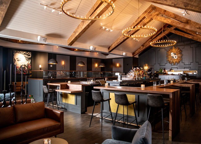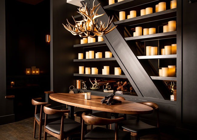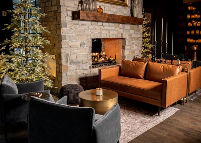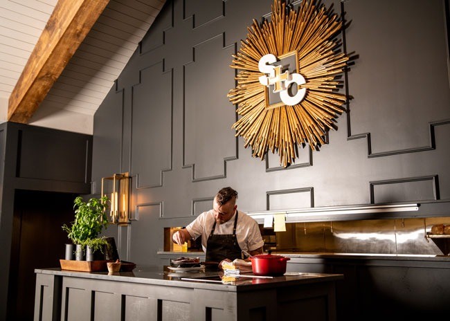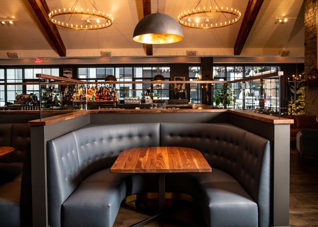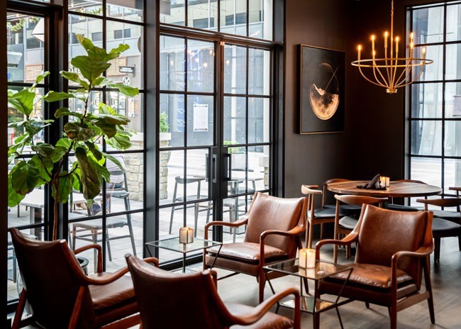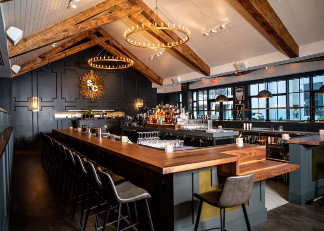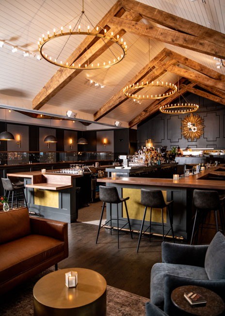 Saints + Council. Photo by Mia YakelLocated on the corner of Peachtree and 15th Streets, the 6,000-square-foot-plus space features dark charcoal walls, modern brass fixtures and reclaimed wood beams on vaulted ceilings. The design is clean and contemporary, but eclectic — “comfortable nostalgia” as Founder William Pitts describes it. A central island bar features small peninsulas that allow guests to sit face-to-face. Comfortable booths, tables and six living room pods — two around a huge stone fireplace —invite guests to choose the type of setting in which they would most enjoy their meal or drink, all while in their own exclusive area. Guests can also capture the exciting action of the chef putting the finishing touches on their meal from a stage overlooking the dining room. The outdoor pergola beckons guests to enjoy a fire pit and cozy booths with heaters and individually heated seat cushions in cooler months while enjoying Midtown’s cityscape.