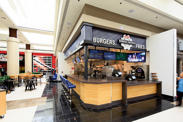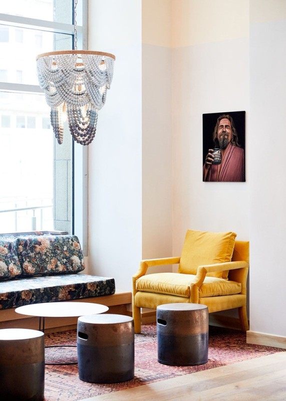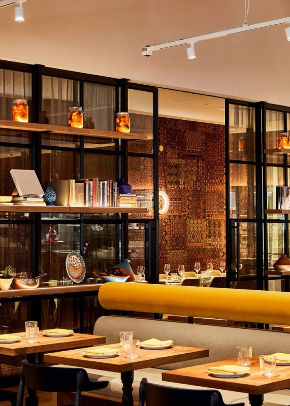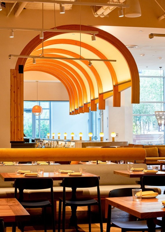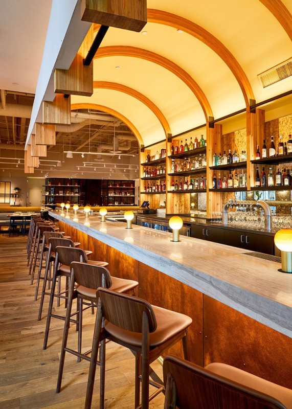 Inspired by Chef Travis Swikard’s own interests, surf and skate references are peppered throughout the space. For example, a “breaking wave” constructed in raw glulam beams is suspended over the bar, and a plush yellow “rail” backrest meant to reflect a Southern California skate park sits above concrete gray banquettes.