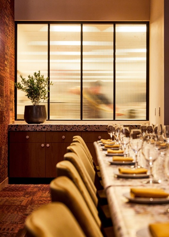 The European oak floors, rust-colored booths and warm lighting leave guests in a space that provides a suspended golden hour, capturing the feeling of sunset for their entire visit. The dining room is surrounded on three sides with a floor-to-ceiling wine room, a private dining room and a chef’s show kitchen.