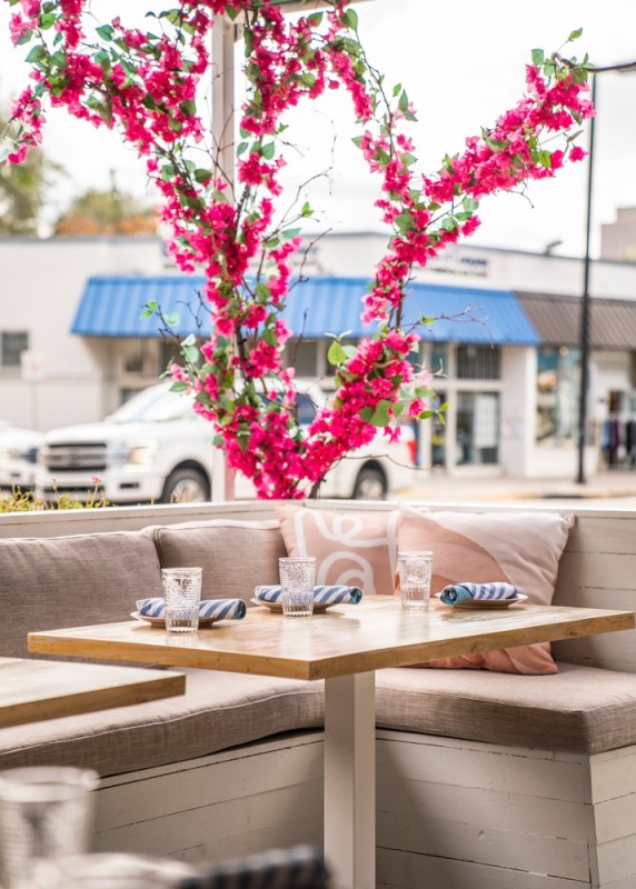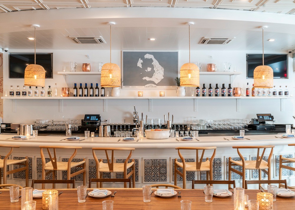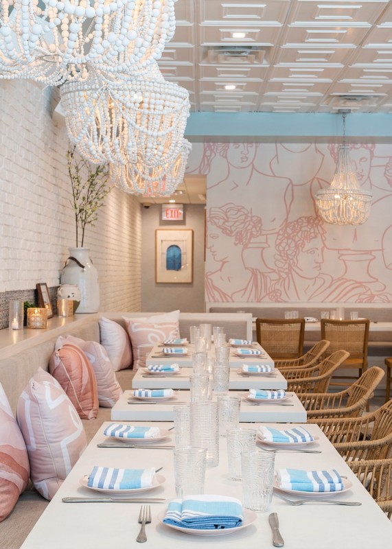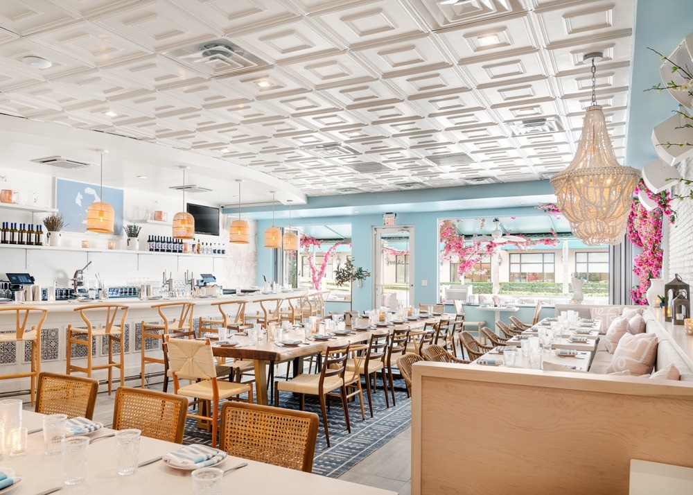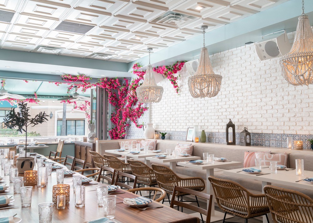 Located on Fort Lauderdale’s Las Olas Boulevard, guests enter from a bougainvillea-covered patio that features white banquettes and a pergola roof. The beachy, Mediterranean-inspired interior features sky blue and white walls. Beaded chandeliers hang above a banquette with linen-covered cushions paired with white dining tables. A mix of chairs dot the space and feature teak, wicker and caning elements.