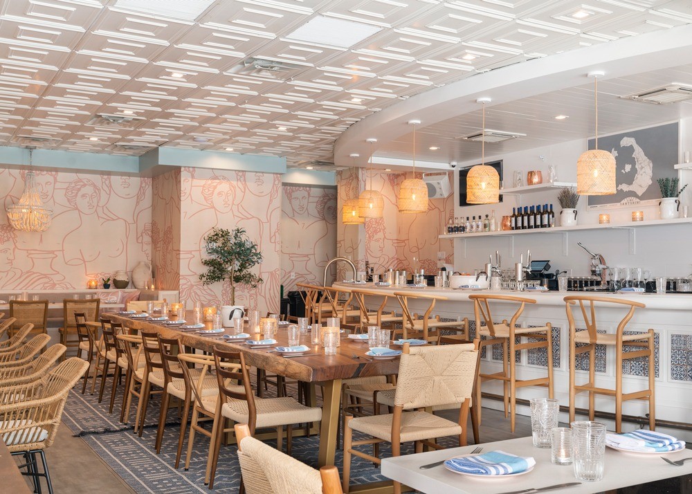 Corresponding with the pink of the bougainvillea at the entrance, the back wall of the dining room is wallpapered in dusty pink line drawings of Greek gods. Whitewashed floors are carried throughout the dining room to the honed quartz bar, which is fronted with blue and white ceramic tiles.