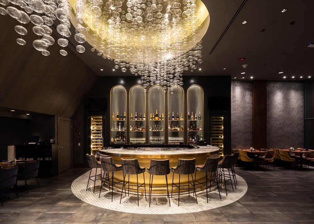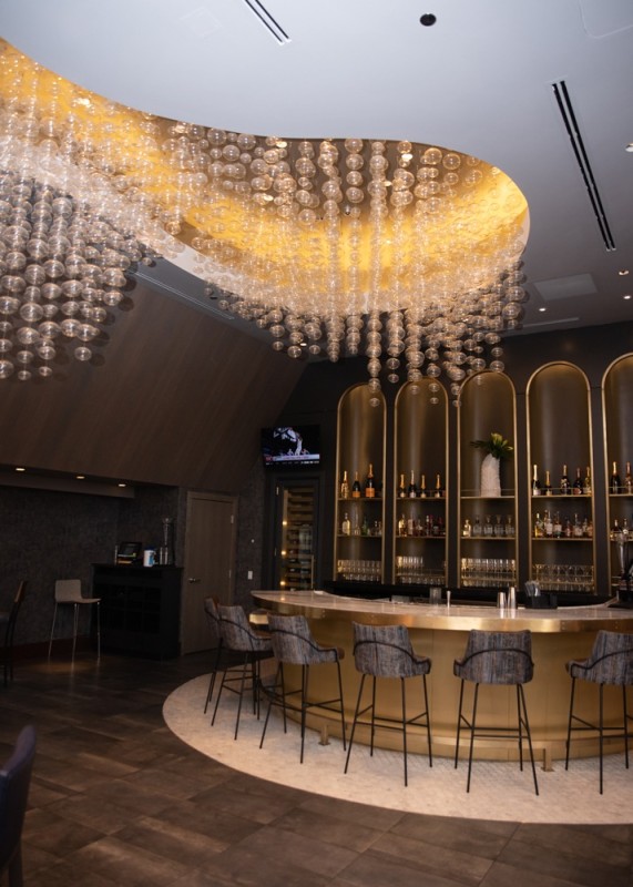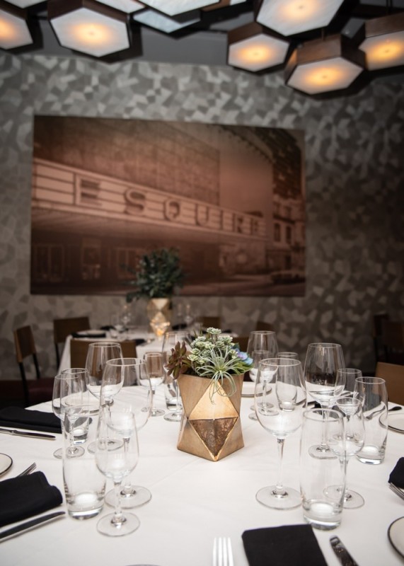 Built in 1938, the Esquire Theater facade and vertical sign have been retained while interior updates were supported by both Aria Group and PGAV Destinations. The three-level structure boasts nearly 24,000 square feet which will feature glamourous art deco-inspired furnishings, fresh floral arrangements, and new wine collectibles displayed throughout. Additionally, a large digital display will be used to promote the restaurant's Visiting Chef Series. The centerpiece of the space is a 50-foot glass-enclosed wine tower holding over 1,600 bottles of wine from around the world. Which is flanked by two large dining rooms with intimate seating, a tasting bar, five private dining rooms and an outdoor terrace overlooking Oak Street. Guests and wine club members will continue to have access to a wine pickup counter.