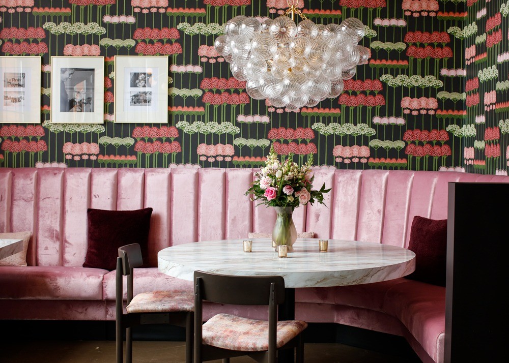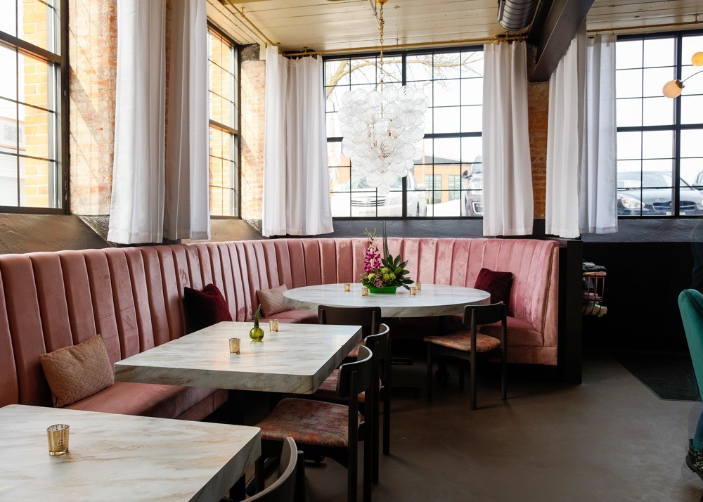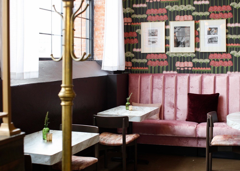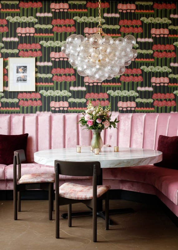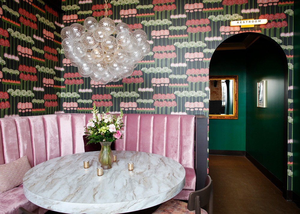 To soften the space and absorb sound, a channel-back booth covered in rosy pink velvet is the primary seating, and a muralist was brought in to create a focal wall that cleverly hides the electrical panel.