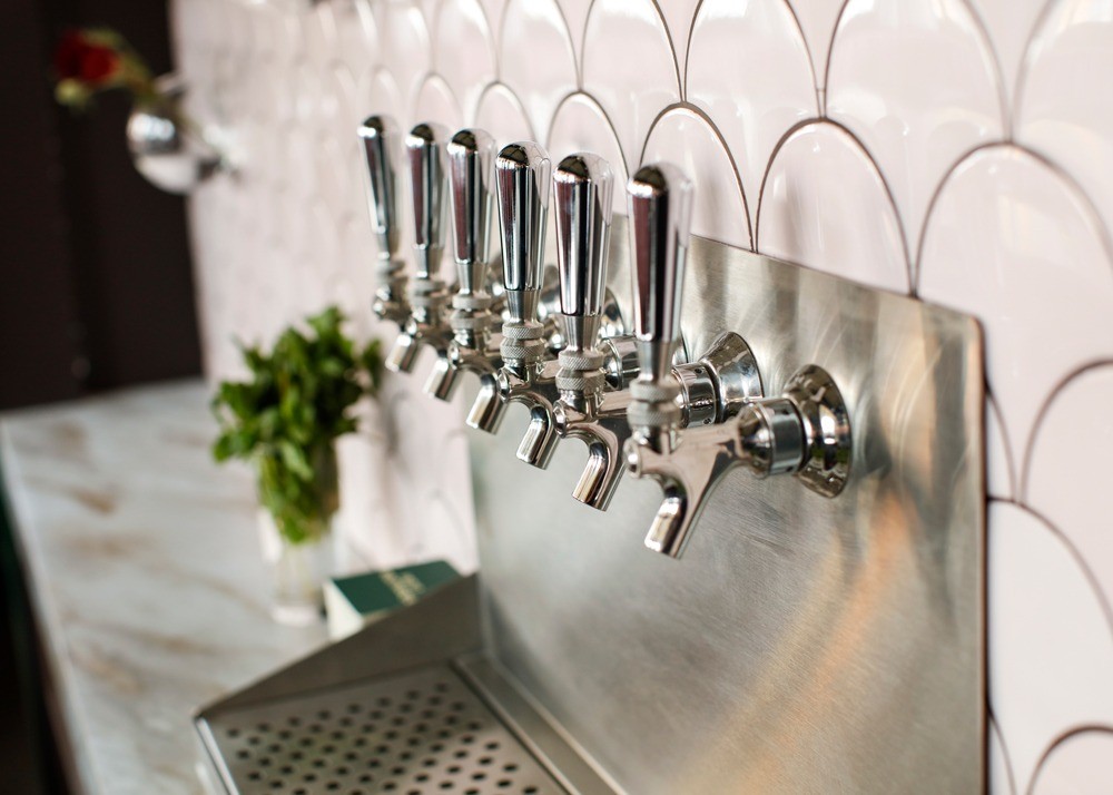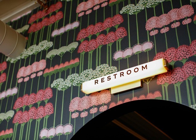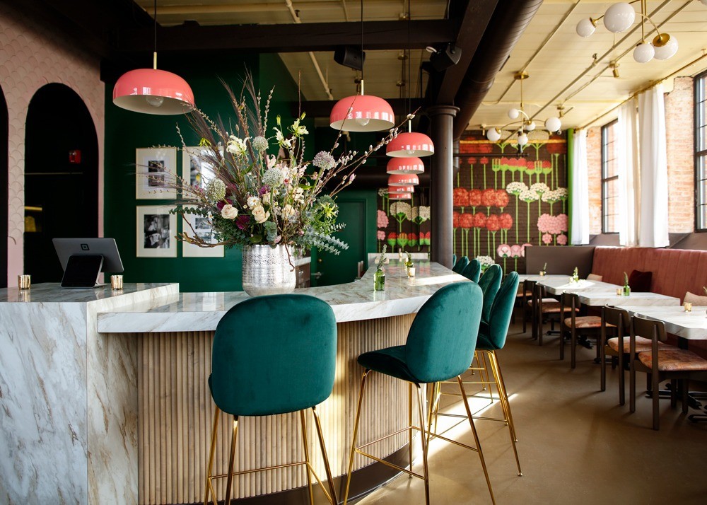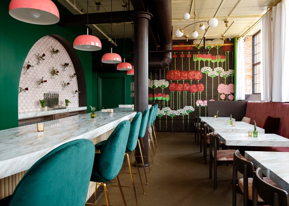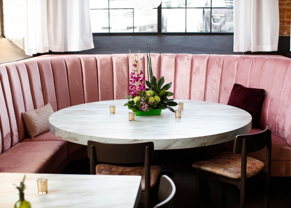 To soften the space and absorb sound, a channel-back booth covered in rosy pink velvet is the primary seating, and a muralist was brought in to create a focal wall that cleverly hides the electrical panel.