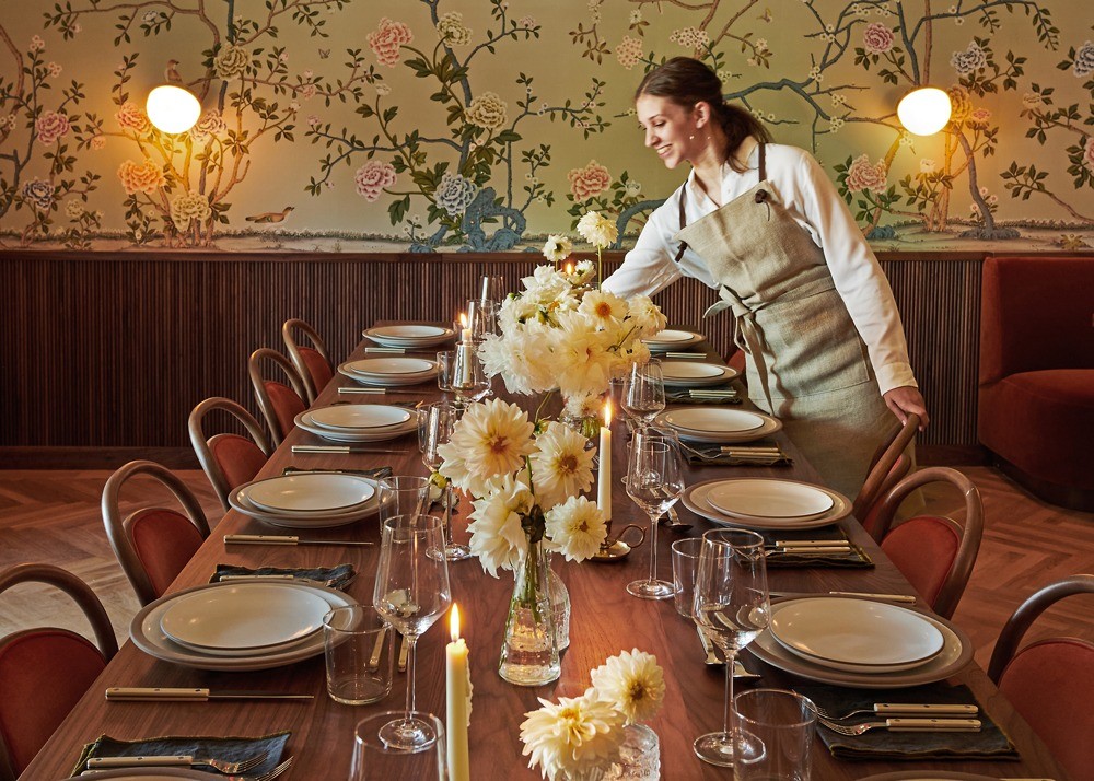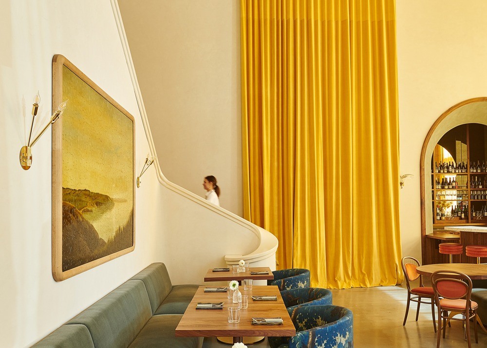Design and culinary influences inspired by both her Iranian roots and her time in France interplay throughout the operation. Inside the Art Deco-inspired cypress façade, layered, handwoven rugs add color and texture. Naturally dyed cotton velvet drapes divide the double-height space and infuse drama. Tones of saffron and pomegranate, chosen for the drapes and seating upholstery, respectively, recall for Vakili childhood years spent on her family’s farm in Iran. Pale blue and teal plaster reference colors of the French coast and are represented more literally in a commissioned feature painting beneath the curved staircase. For the private dining area upstairs, the designers enlisted a French design house to create hand-painted scenic garden wallpaper featuring florals and pomegranate trees on a blue silk background.
