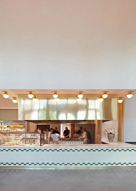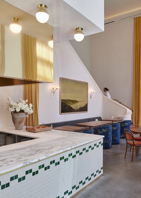 The restaurant’s various spaces had to be flexible and easily accessible throughout the day, but also provide a more elevated, intimate experience for evening occasions. “Forough pointed us towards the casual elegance found in Parisian and Viennese cafes and we filled the spaces with pieces made famous by these storied establishments,” notes Alonso. Such pieces and materials include classic bentwood chairs, custom tables inspired by minimalist French designer Jean-Michel Frank, vintage Viennese chandeliers and sconces, Persian rugs, botanical textures, warm walnut and brass accents, white marble and artisan ceramic tiles. The result, he adds is, “A truly personal space — a restaurant that is home to a uniquely multi-national life.”