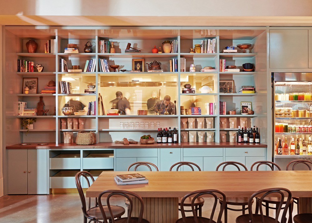Designed by Los-Angeles-based studio Commune and two years in the making, the 6,300-squre-foot, two-level space includes an open display kitchen with custom range and wood grill as its centerpiece. The kitchen is flanked by a market with oak communal tables on one side and a more formal dining room and wine bar on the other. The market area also includes a barista station, bakery, grab-and-go food cases and display of kitchen essentials. From the dining room, an elegant staircase leads up to a hidden mezzanine that serves as a 40-seat private dining and event space.