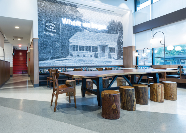 Discovering the 1946 building’s blueprints lent design inspiration and authenticity to what became the 1946 Pavilion outside. There, guests sit in a re-creation of the original Dwarf Grill, which had 10 counter stools and four booths. “That element is a big storyteller for us,” Allstun notes. “A lot of people assumed the 1967 building was the original, but in the Pavilion they discover the real original. It’s set on the exact same spot and was built to scale using the original blueprints. The steel structure framing it represents the old building’s framing structure and windows. When you enter, it’s like you’re walking through the threshold of that ’46 building. It’s a really cool way to pay homage. We have a lot of operators from around the country come to our offices in Atlanta, and they bring their teams here to show them the humble beginnings, where it all started. It’s inspiring for them and a point of pride for the community. It brings everything back to the point that this really is the brand’s home.”