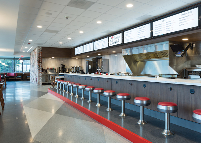 The diner side of the building faithfully recreates The Dwarf House experience and menu. “It was important to keep a lot of the heritage and nostalgia, especially on the diner side,” notes Allstun, who collaborated with Atlanta-based design consultancy Sense Makery on storytelling strategies. “It’s bigger and brighter, but when people walk in they see the same layout and even the same 14 counter stools from the ’67 building. We just refurbished them and added two additional ADA-compliant counter seats. The booth layout is the same, as well, but we added some four-top tables that can be pushed together for larger groups.”