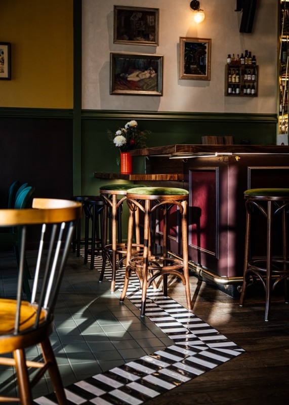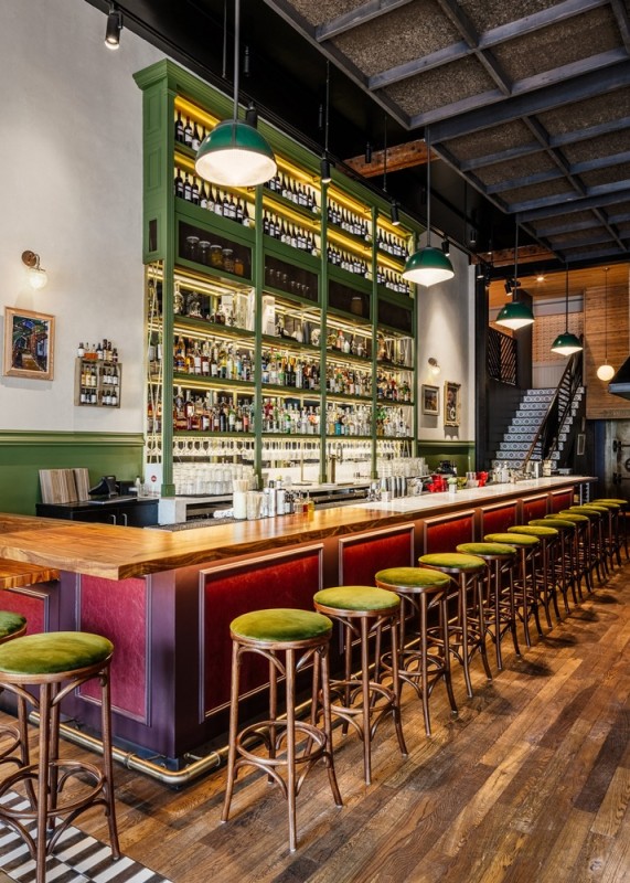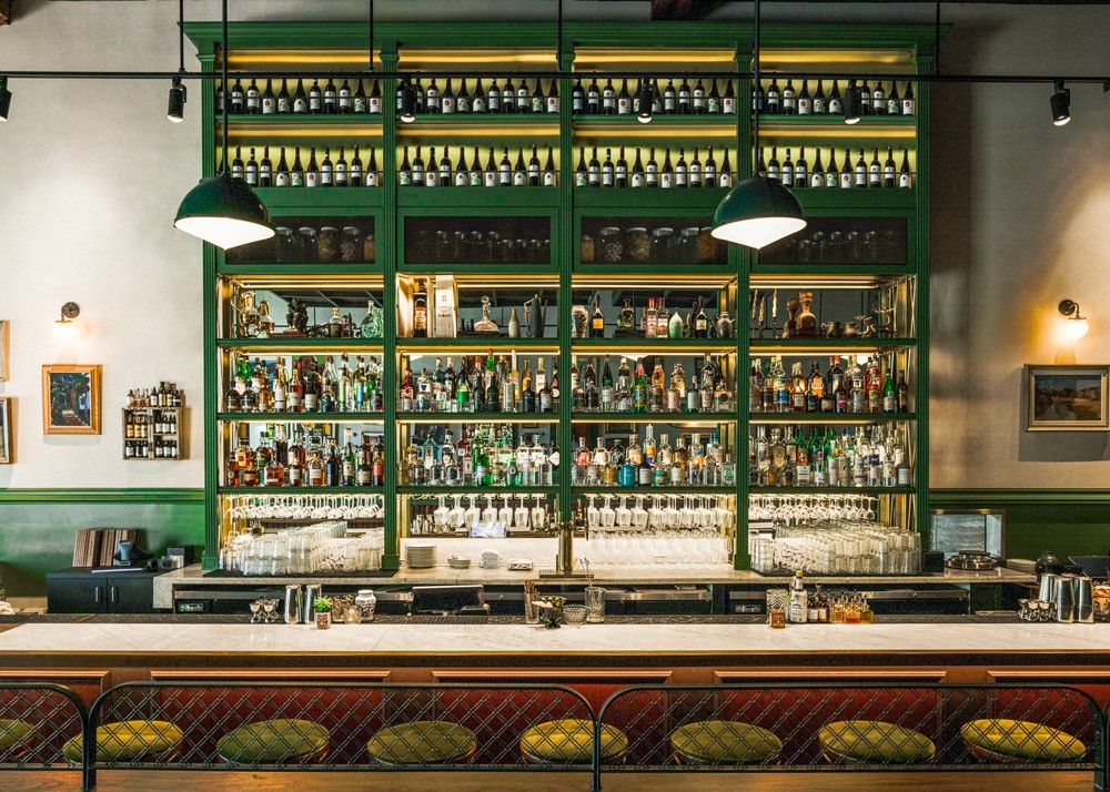 A grand back bar serves as the focal point of the room, with olive green shelving that provides for a dramatic display of eclectic gin and vermouth bottles. The aged Carrera marble bar is faced with faux leather and painted wood paneling.
