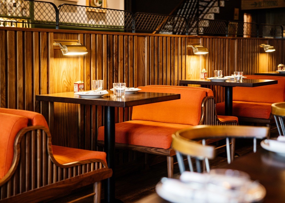 Bar Moruno "needed to be a true neighborhood restaurant to work within the Silver Lake neighborhood," says Bleier, "so we focused on making it familiar and relaxing for people." On the dining side, two-person booths constructed of slatted walnut feature tapered legs and paprika upholstery. A gallery wall of artwork and mirrors recalls Spanish bodegas.
