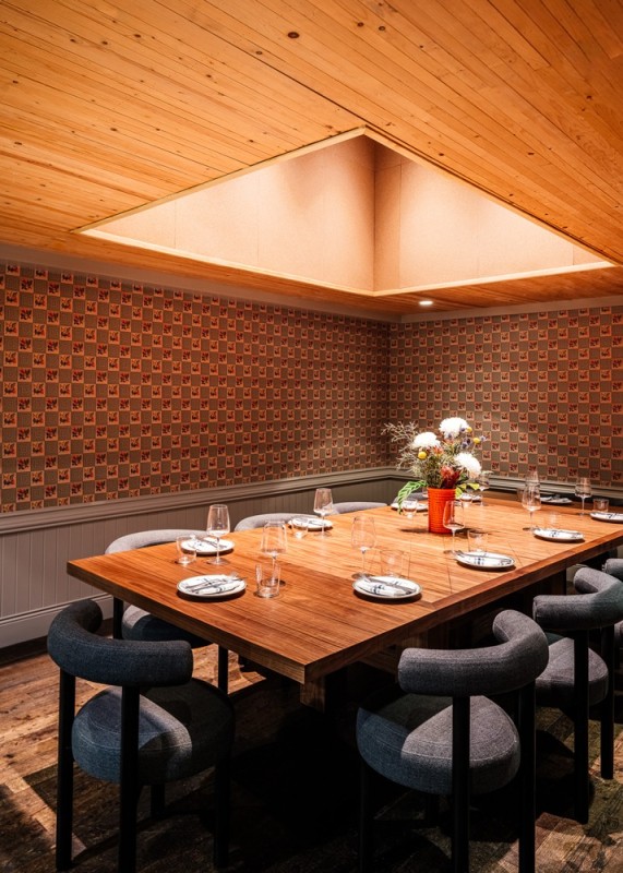 At the center of the space, a low partition of ribbed walnut topped with a decorative mesh screen serves the dual purpose of expanding the bar footprint with a drink rail and providing privacy to the main dining room.