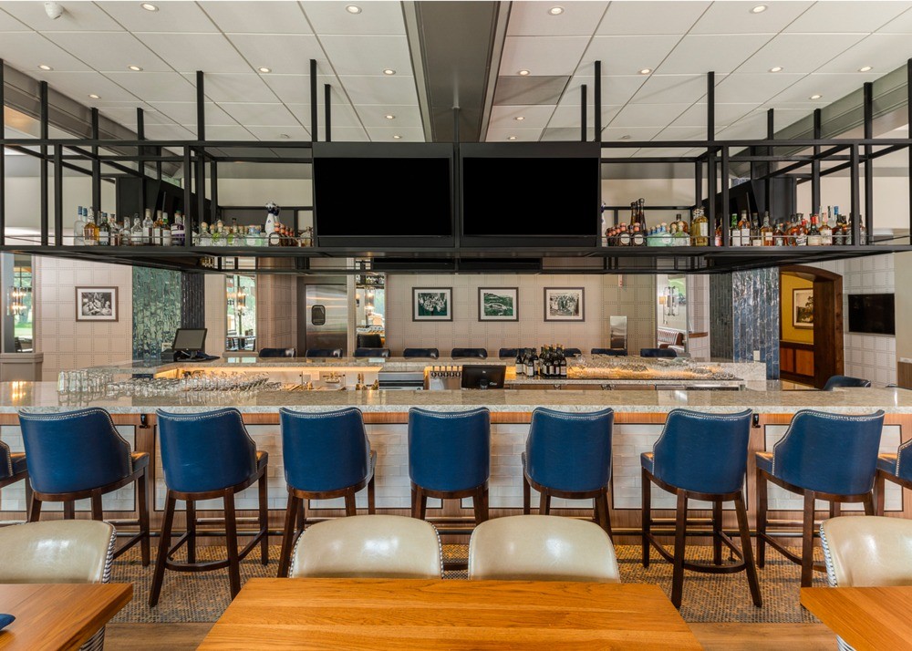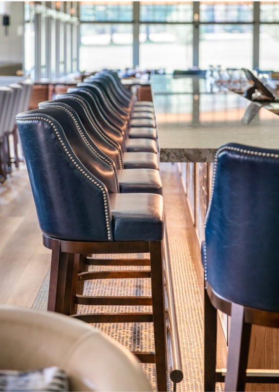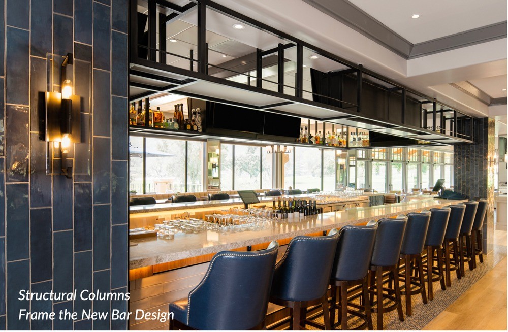 Instead of working around the columns, designers opted to work through them, positioning a portion of the bartop between the two load-bearing columns. These bar seats are now considered premium seating, offering guests a sightline through the lounge, past the veranda and ultimately out to Marin Country Club’s lush grounds.