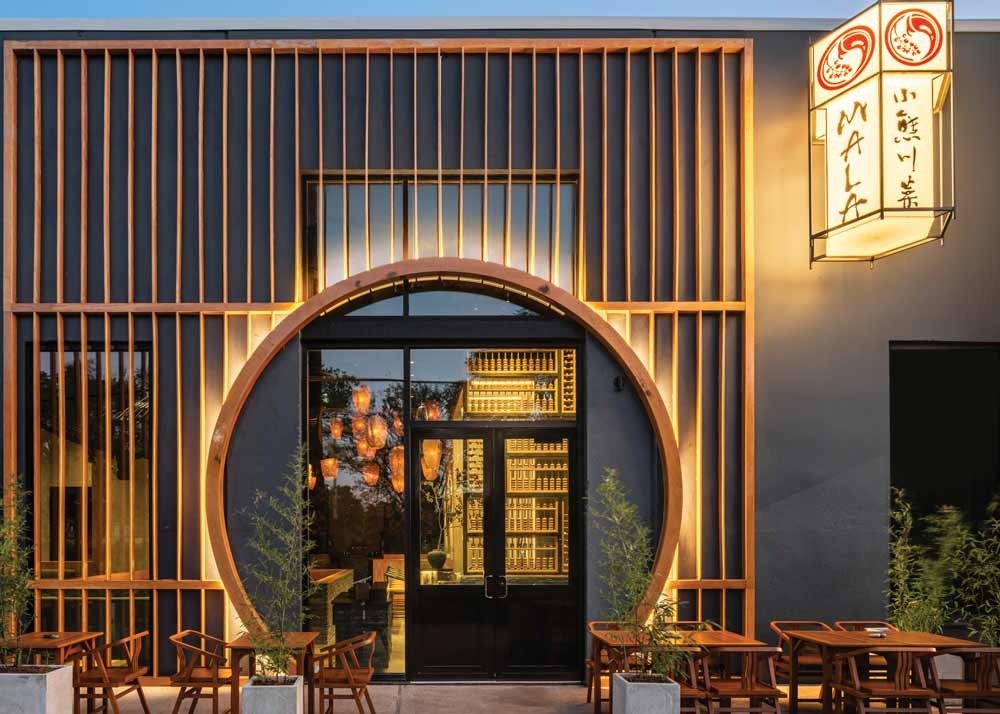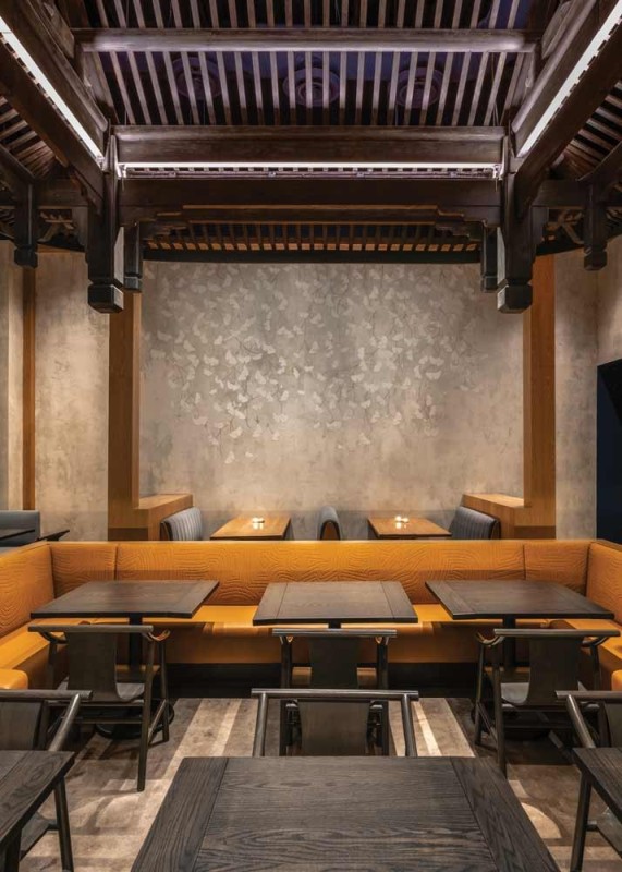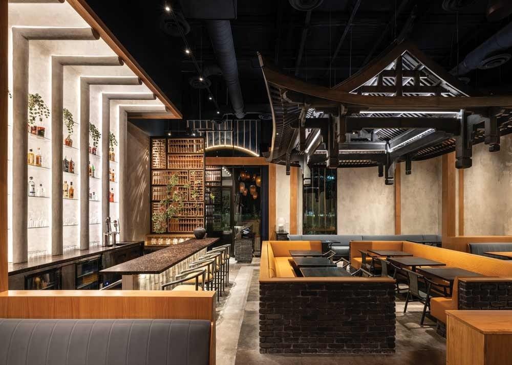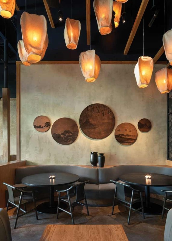 Gin design group brings the natural beauty of the Sichuan countryside to this restaurant inside the MKT mixed-use marketplace in Houston via the use of art installations and finish applications. A handmade wooden frame of a traditional Chinese pagoda is installed above a central seating area and dozens of glowing Chinese lanterns float up to 20 feet above as if just released into the sky. Impressions of ginkgo leaves glow on earthen plaster walls, traditional clay roof tiles from the bar and stack brick creates a rustic seating area at the entry. The patio connects the restaurant to a popular bike trail.