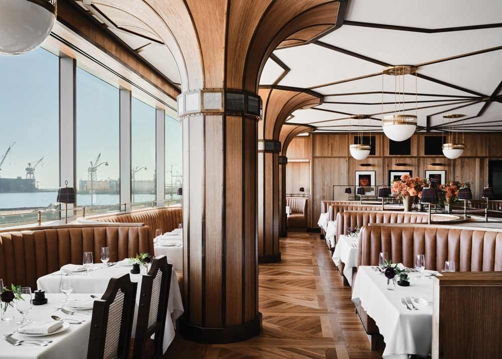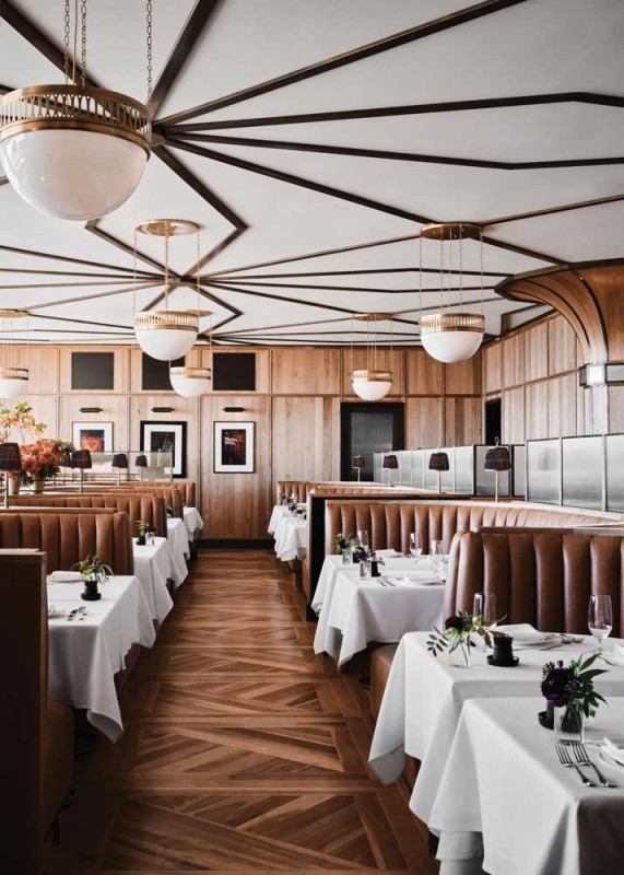 Spread across two floors, this 7,000-square-foot waterfront steakhouse was designed by Ken Fulk, executive architect with MBH Architects, for celebrity chef and operator Tyler Florence. On the first floor, guests can enjoy drinks while sitting at the counter and full bar. The main dining room and kitchen are located on the second level. Both floors boast unobstructed views of the San Francisco Bay, connected by an elaborate wrought iron central stair that provides a seamless flow in the restaurant. The team framed the restaurant’s interior with brass millwork and dark marble finishes featuring a caramel and gold color palette to create a feeling of elegance. The interior features plush, circular booths; custom-cut dining tables; and lighting that gives off a golden glow. The sophisticated, 147-seat upscale dining destination also offers a private dining room for intimate occasions, table-side service with food carts, and an outdoor patio.