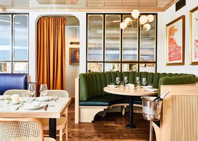 Collins sees a blurring of the line between fine- and casual-dining environments, enabling greater creativity on both sides. At Chez Noir, her team created an unfussy yet fine-dining experience using rich colors and both luxe and natural materials. Image courtesy of Erin Ng