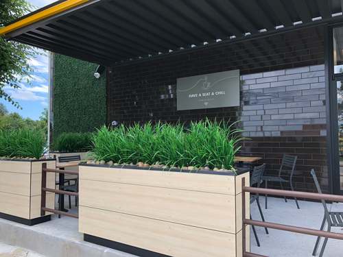 Zones can be designated as different or reserved with a certain color of umbrella or seating. Planters can also be moved around to open up and block access to keep events private or open up a space to all restaurant guests.