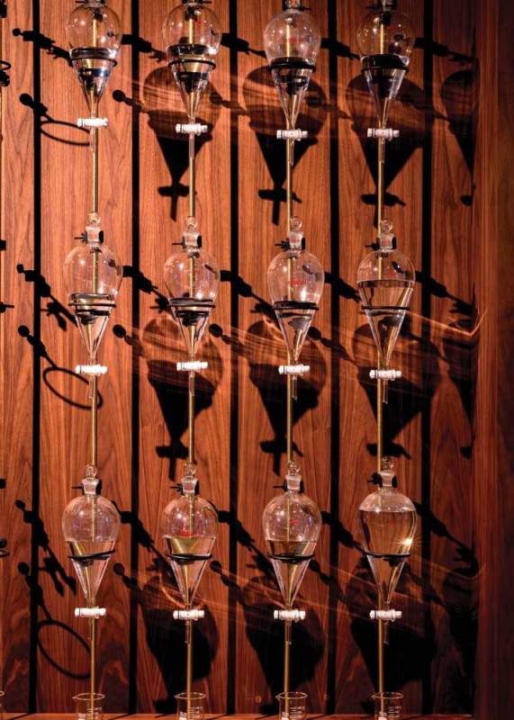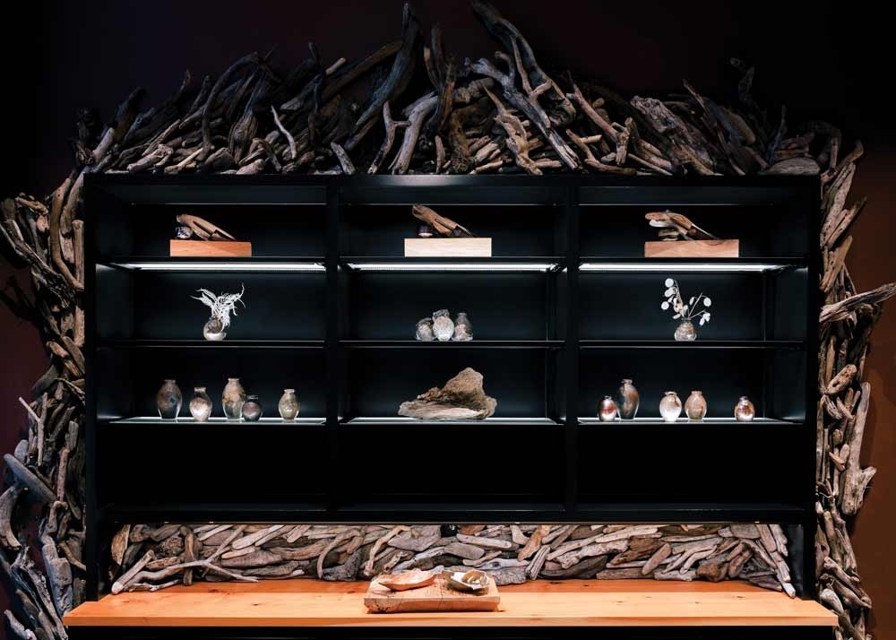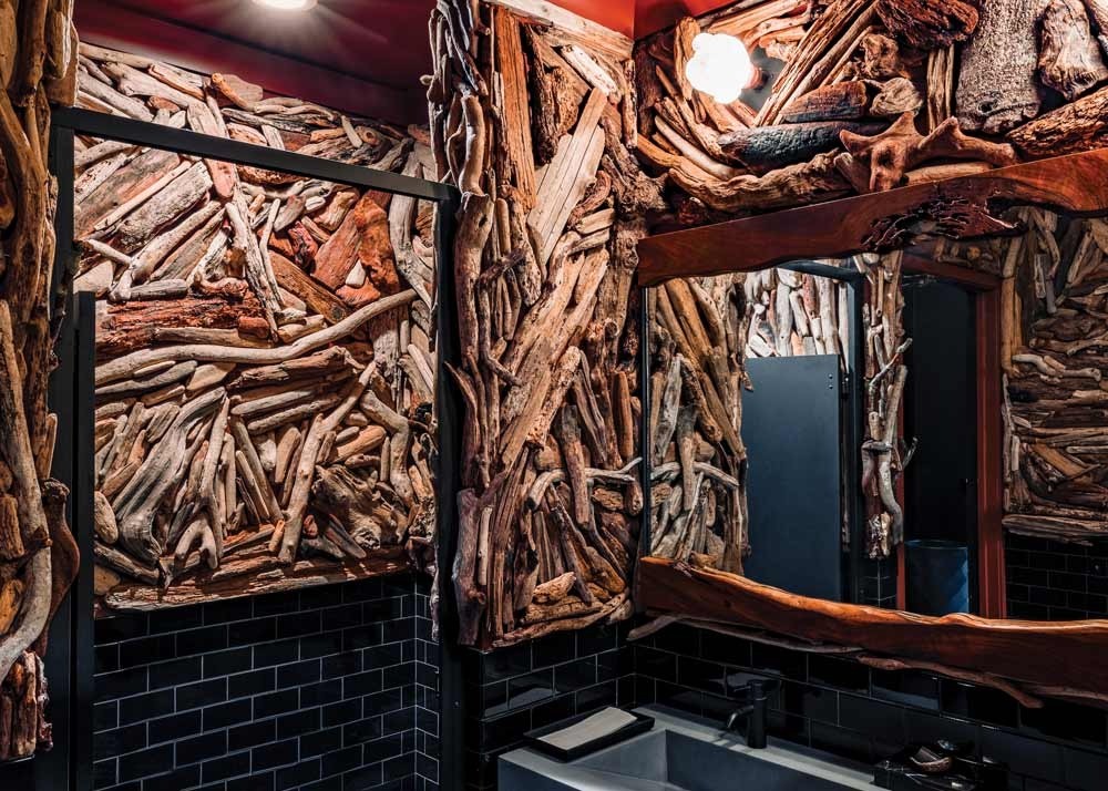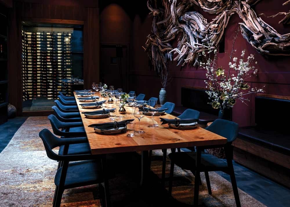 Originally a 1940s warehouse featuring a barrel roof of exposed Douglas Fir, the restaurant’s wood-fired oven serves as a focal point. Black walls and dim lighting accented by custom walnut woodwork and cabinetry evoke the dark depths of the ocean. Japanese shou sugi ban detailing and bronze touches complete the main dining room design. Glass light fixtures add flair to the bar, bathroom and private dining room, while approximately 2,500 pounds of driftwood lines the bathroom walls.
