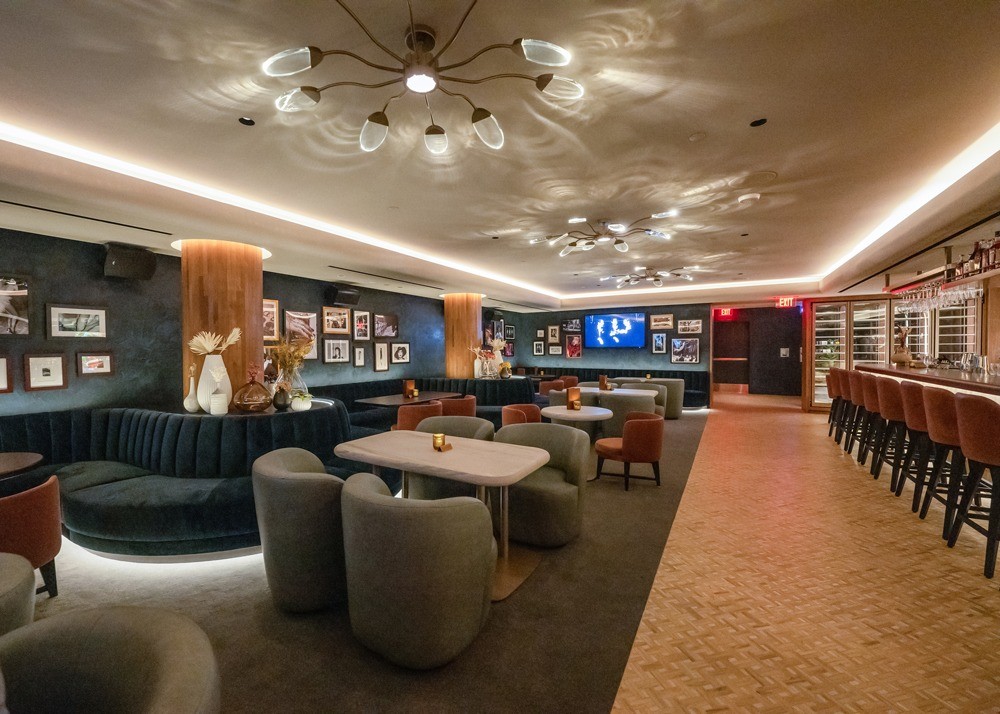 Karen Herold, principal, Studio K, took inspiration from natural elements, as seen in the light wood tones that are set against ocean blue hues and in the repeated soft wave shape that’s carried throughout various lighting, seating and architectural details such as windows and alcoves.