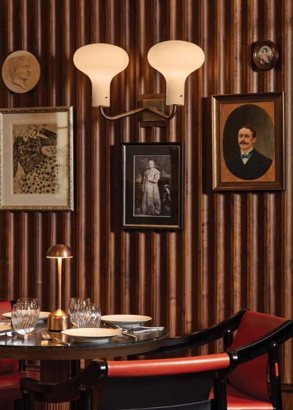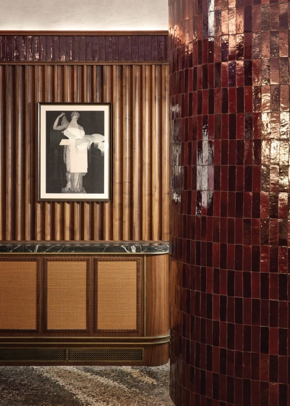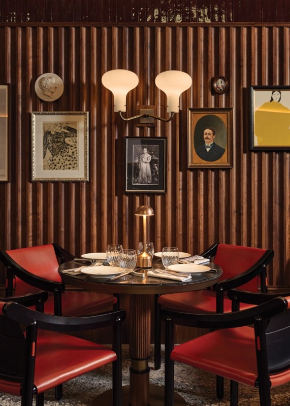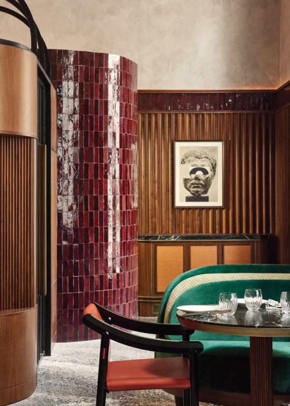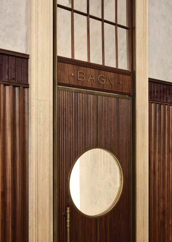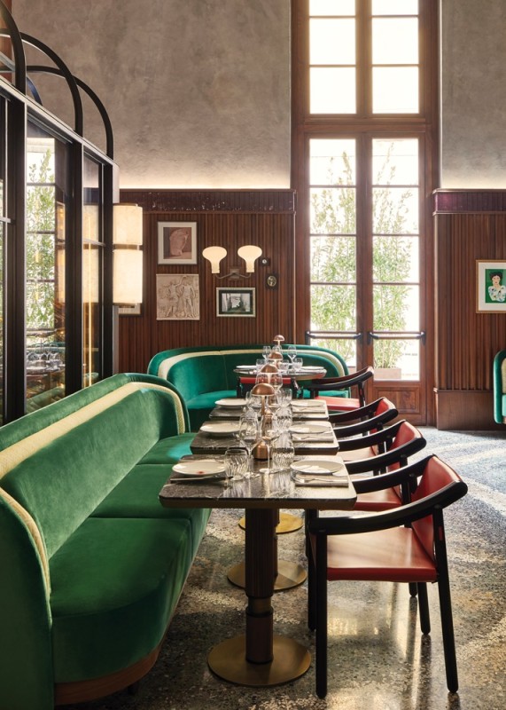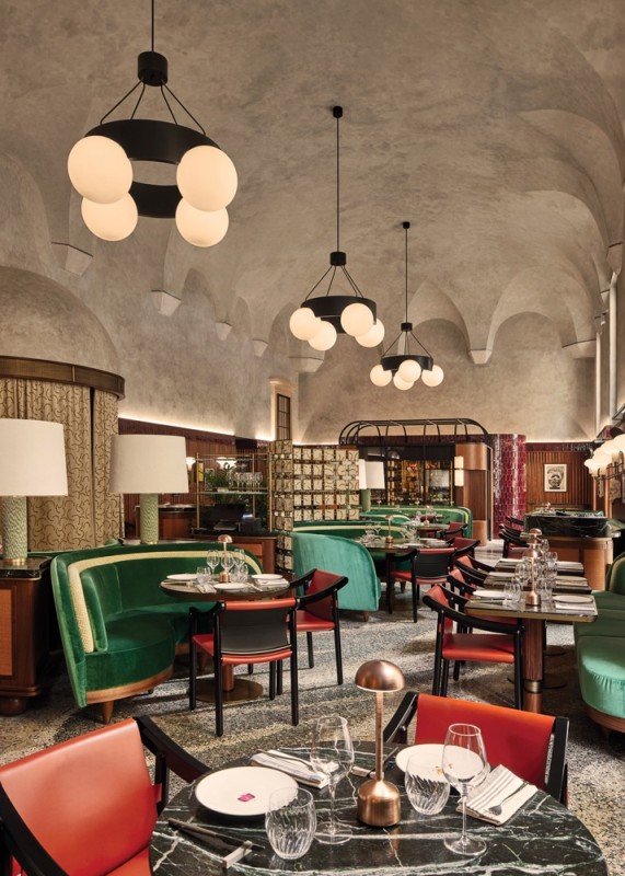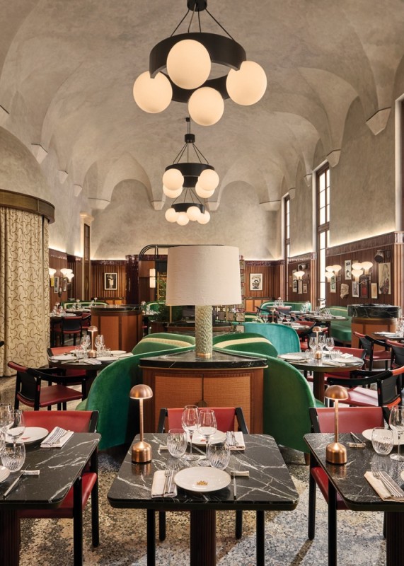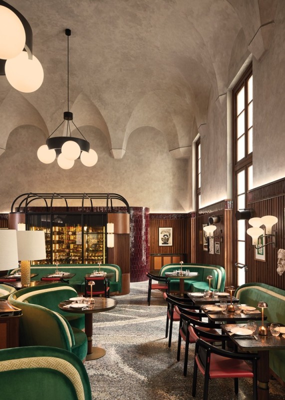 In terms of design, the open kitchen, bar and dining room connect under a dramatically high nave as the restaurant sits inside the former chapel of the Archiepiscopal Seminary. Bronze and frosted glass lamps highlight marble tables and classical chairs below. Uniting the space is its terrazzo floor — a mix of green, black, white and burgundy — done in a wave pattern that pays tribute to the building’s architect Luigi Caccia Dominioni.