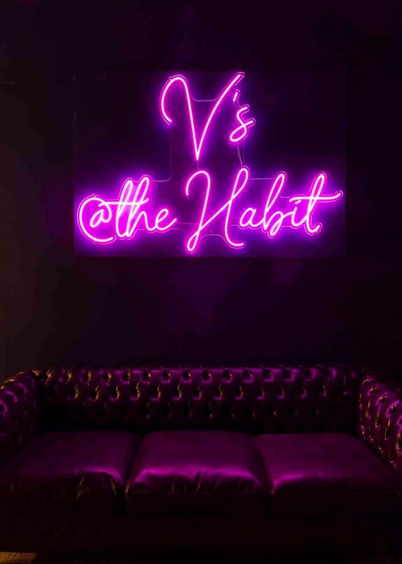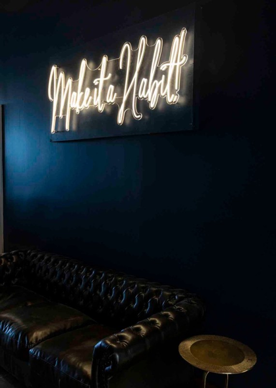 The team behind The Habit curated a luxurious and cheeky experience in the venue's second-floor VIP lounge, V's, by melding glamorous art deco details with vintage Playboy magazines and a custom neon sign that reads, "Make it a Habit!"