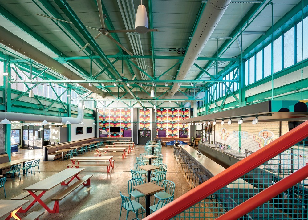 Aslin Brewing Company tapped architecture and design firm //3877 to bring the brand’s vision to life. The vision included an interior and exterior renovation of the historic Strip District Terminal building. This two-story project spans nearly 13,000 square feet and features a 10-barrel brewhouse, an 18-seat bar, cafe, dining areas and an outdoor patio. The bar is the heart of the project, impressively anchoring the space and centered between two expansive columns. The exposed steel structure is painted bright green and orange and features expansive windows and colorful graphics, filling the environment with character and energy while accentuating the structure of the historic space.