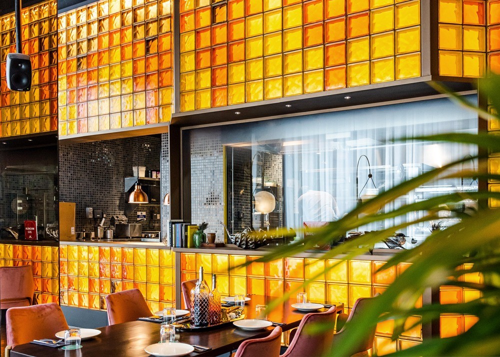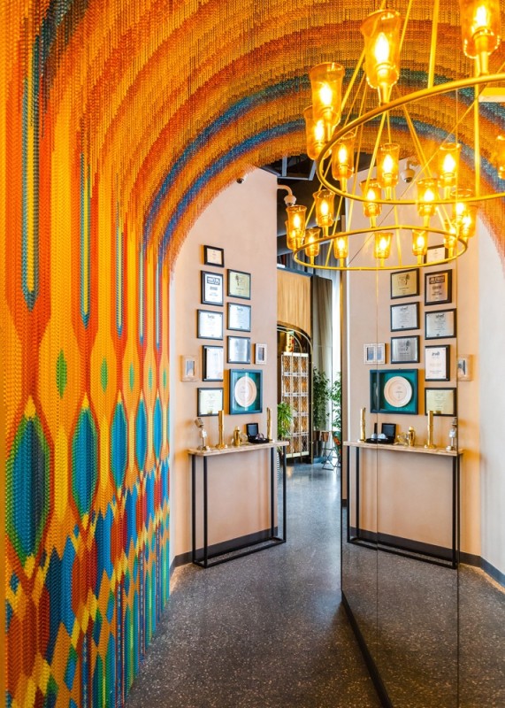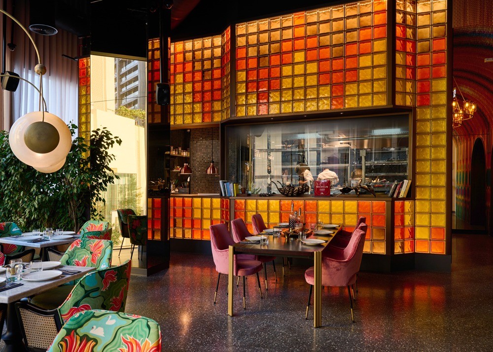 A "kaleidoscopic chainmail" entryway welcomes guests into the restaurant. An open kitchen is the focal point of the dining room, which is surrounded by yellow and amber-colored glass blocks, designed to glow like the embers of a traditional tandoor oven.