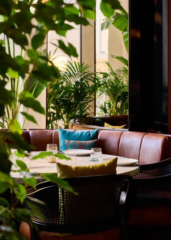 Natural elements like cane-backed barstools and live plants are found throughout the space and add a calming effect to the restaurant's overall bright and playful design.