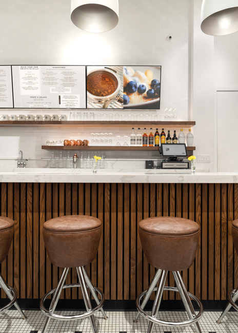 The wood-spindled POS face is topped with a marble-style white quartz, creating an elevated, dramatic effect. And, in a clear nod to the concept’s diner-influence, the floor is a black and white patterned tile that was custom-made. This design, says Laudizio, is more complex than it looks and adds drama to the space.