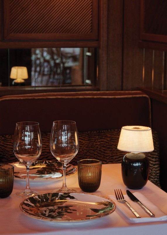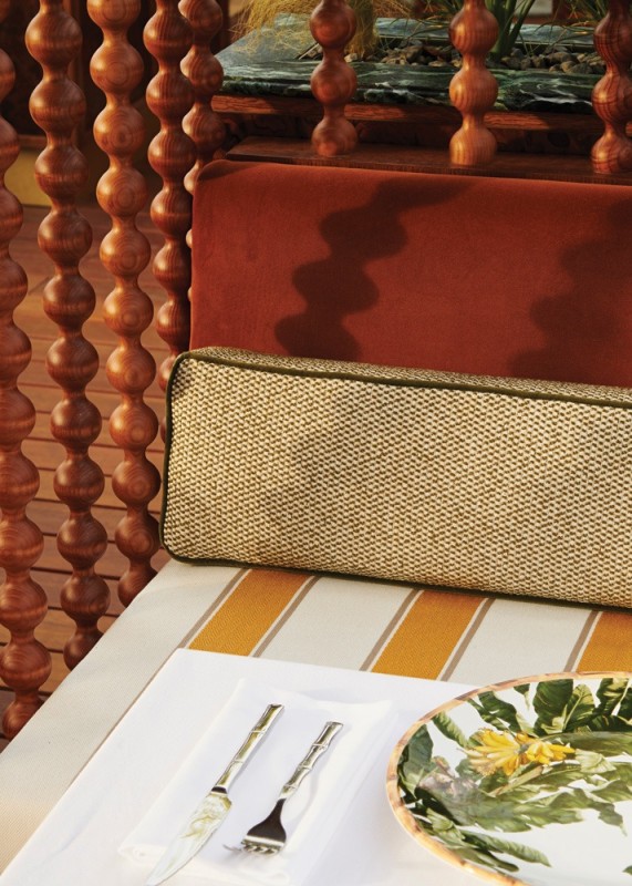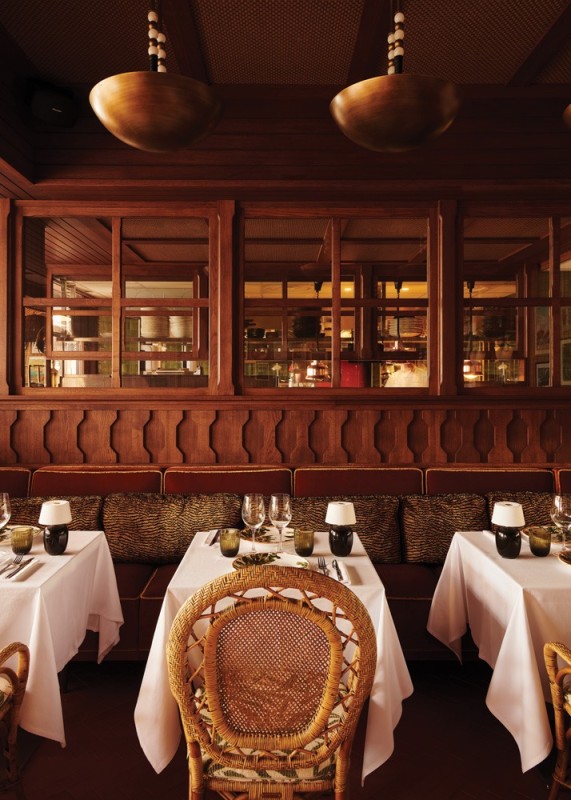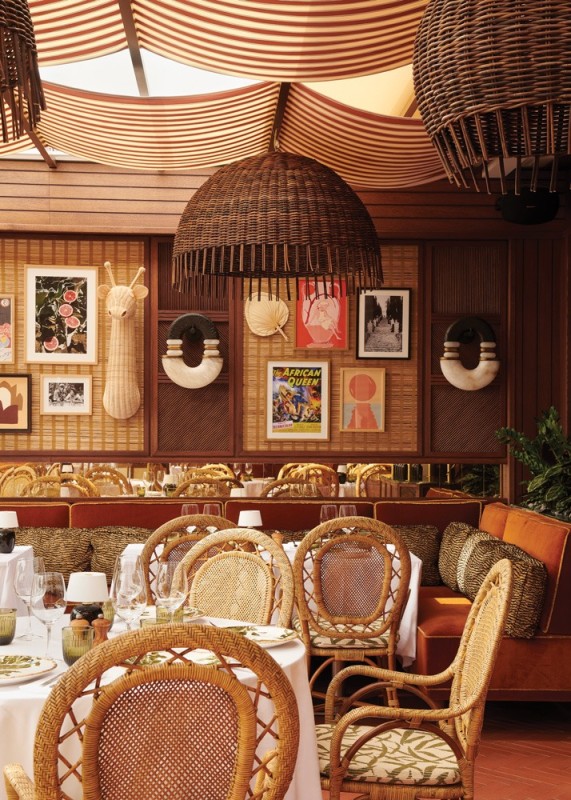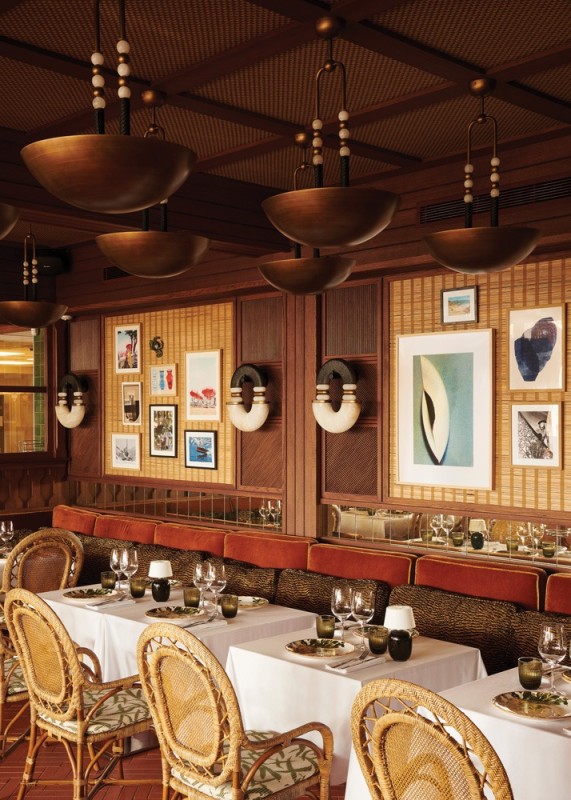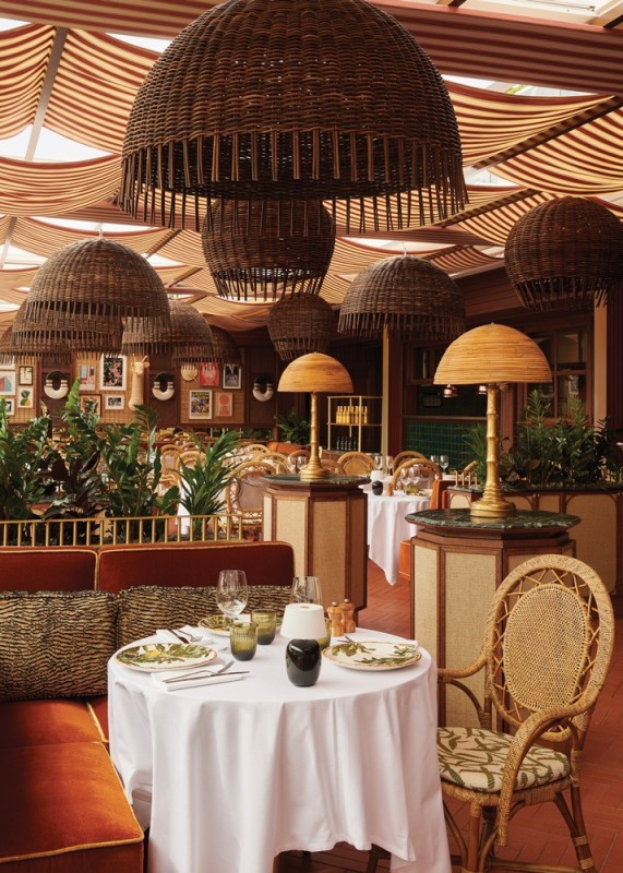 The vibe blends a variety of influences, from the restaurant’s 1970s heyday to lush vegetation to views of the Mediterranean. Wood is omnipresent, with panels covering the walls and framed natural fiber panels evoking African mats on the walls. Custom-design light fittings resemble pearl and cowrie shell ornaments. The restaurant’s original orange color remains present on velvet-topped benches. Cushions decorated with zebra patterns accessorize elegant rattan chairs with rounded backs. A red and white striped fabric hangs from the ceiling, suggesting a ship’s sail.