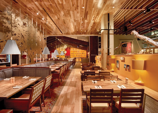 Farmers Restaurant Group, is “always trying and exploring different products because things are always coming out,” says Hardcastle. “We use some reclaimed materials, we try to use local and sustainably harvested wood.” And each restaurant tends to be a composite, using some traditional materials and as many better materials choices as possible. “We always want to stand out and be unique, and that drives the search for new products that align with our principles,” she adds.