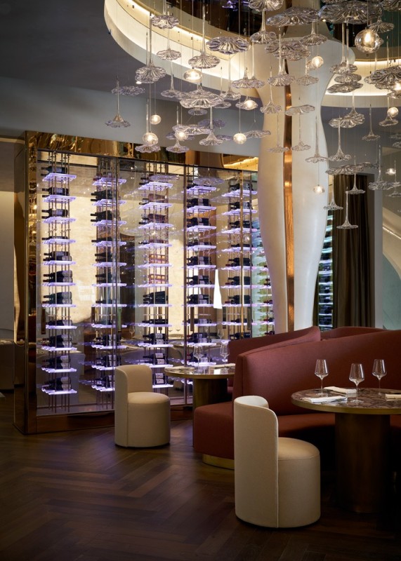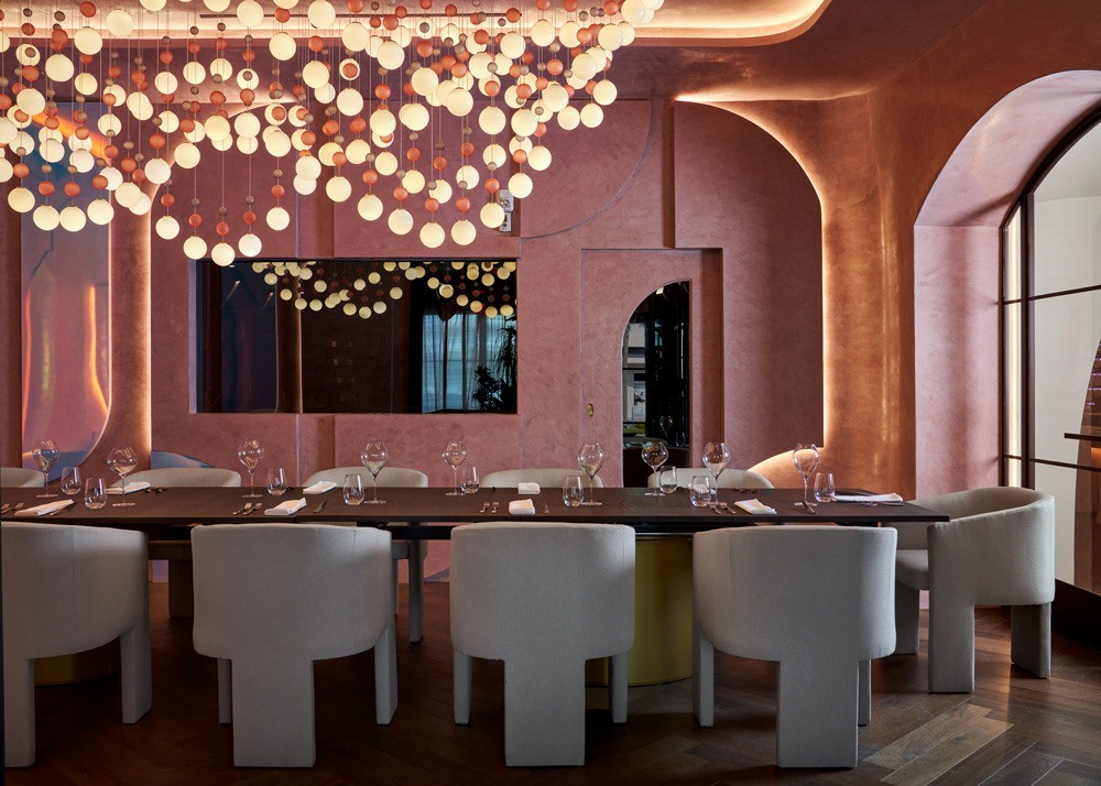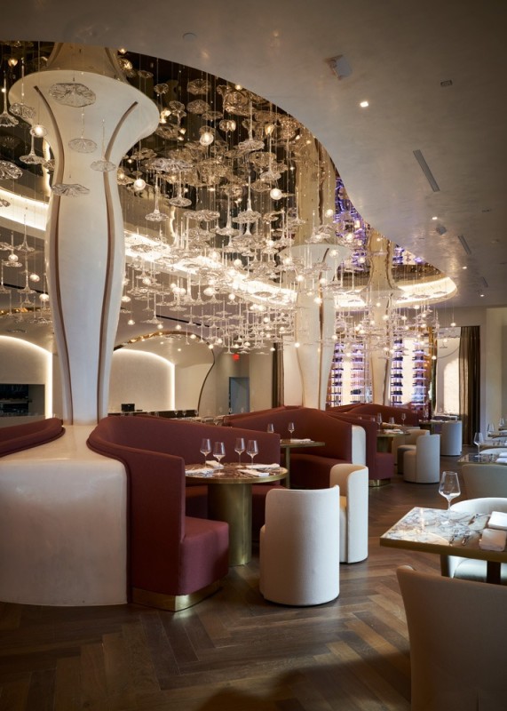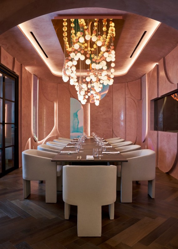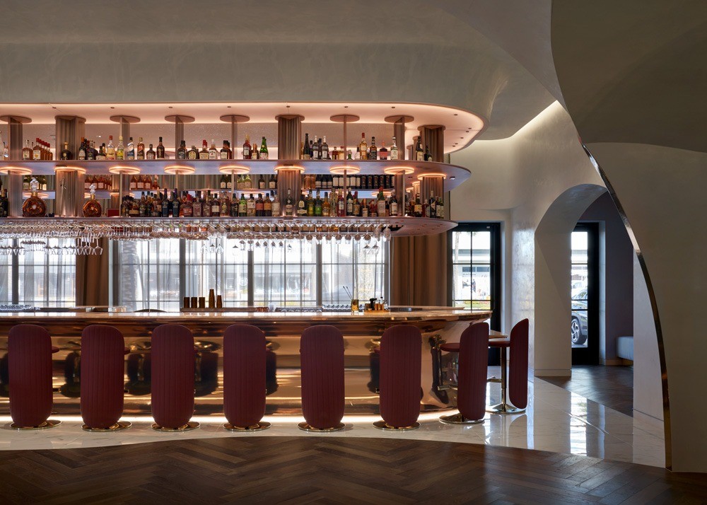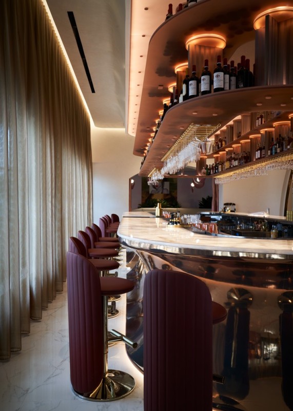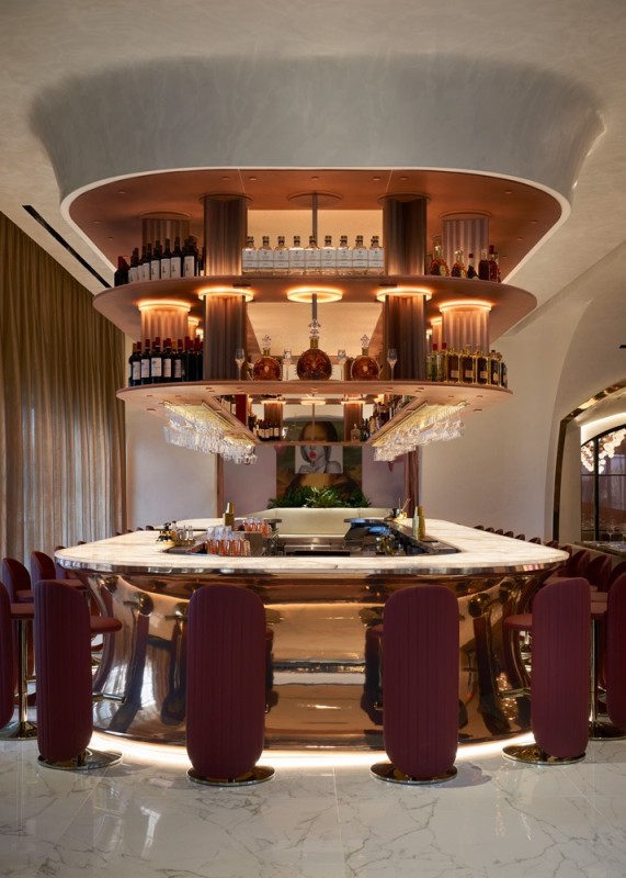 Wittman worked with Nina Magon Studio to create the vision for the interiors. The result is a mix of sophisticated elegance and whimsy adorned in pinks and gold and polished metals. Every surface is curved, including the golden horseshoe-shaped bar that was inspired by the Plaza Athénée in Paris, one of Edith’s favorite places. A sparkling canopy of crystal lights provides a soft glow in the main dining room.